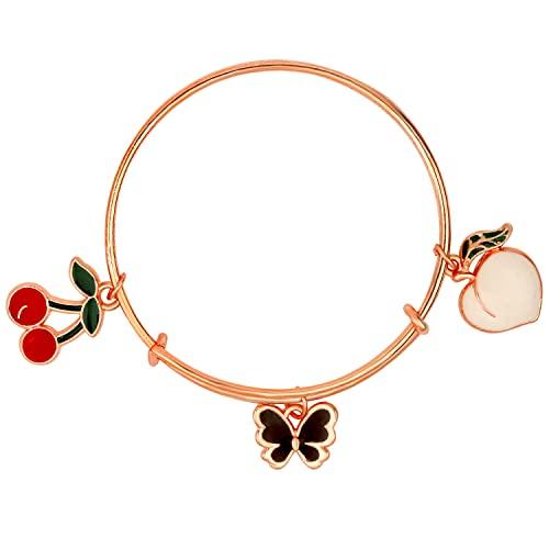 Adorn your wrist with this stunning bracelet featuring cherry and butterfly shaped charms with rose plated enamel work. A delightful accessory for any outfit.