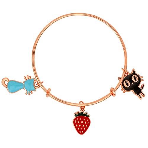 Adorn your wrist with this lovely bracelet featuring strawberry and cat shaped charms. It is beautifully crafted with enamel work and rose plated for a stunning look.