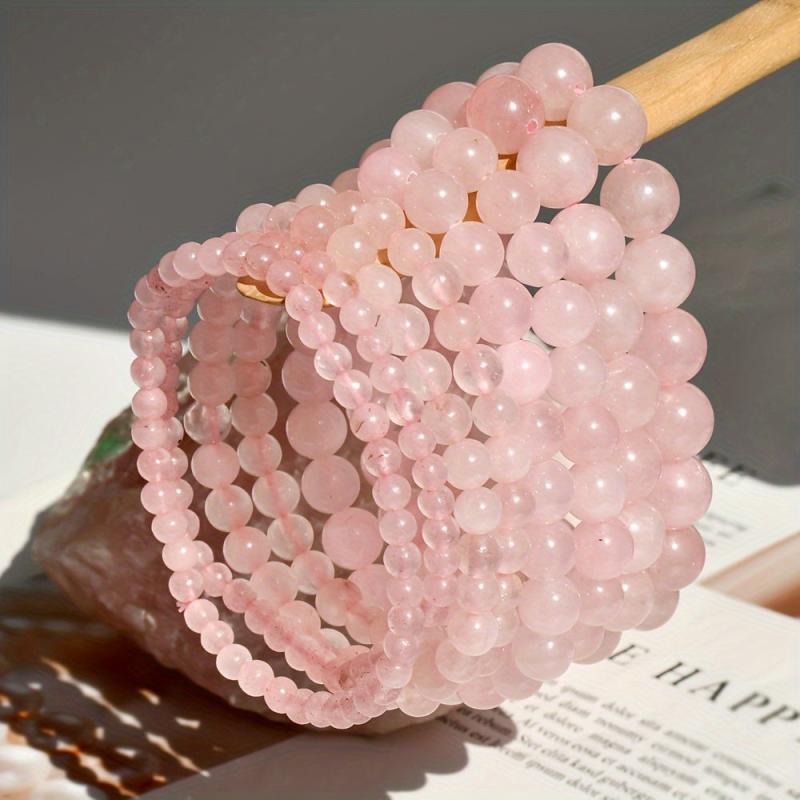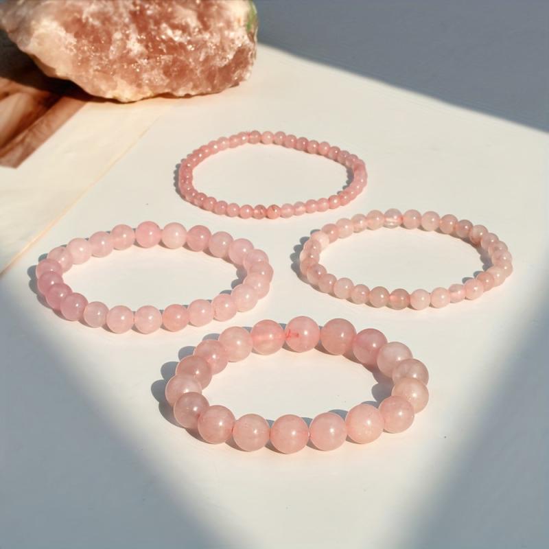 Elevate your style with this set of 4 natural rose quartz elastic beaded strands, perfect for boho and vacation looks. Handcrafted stone jewelry that can be worn all season, adding a touch of elegance to any outfit.