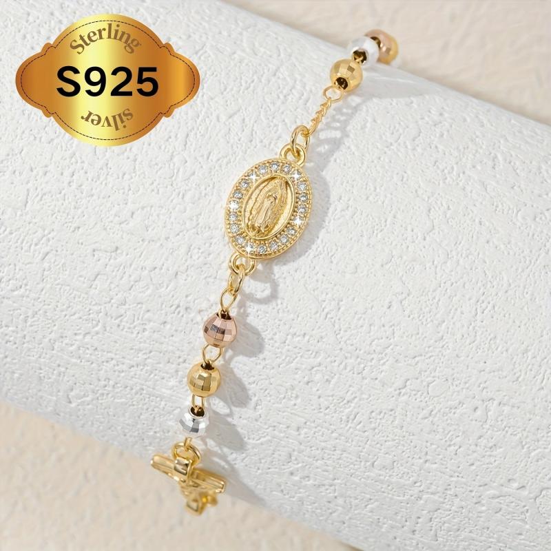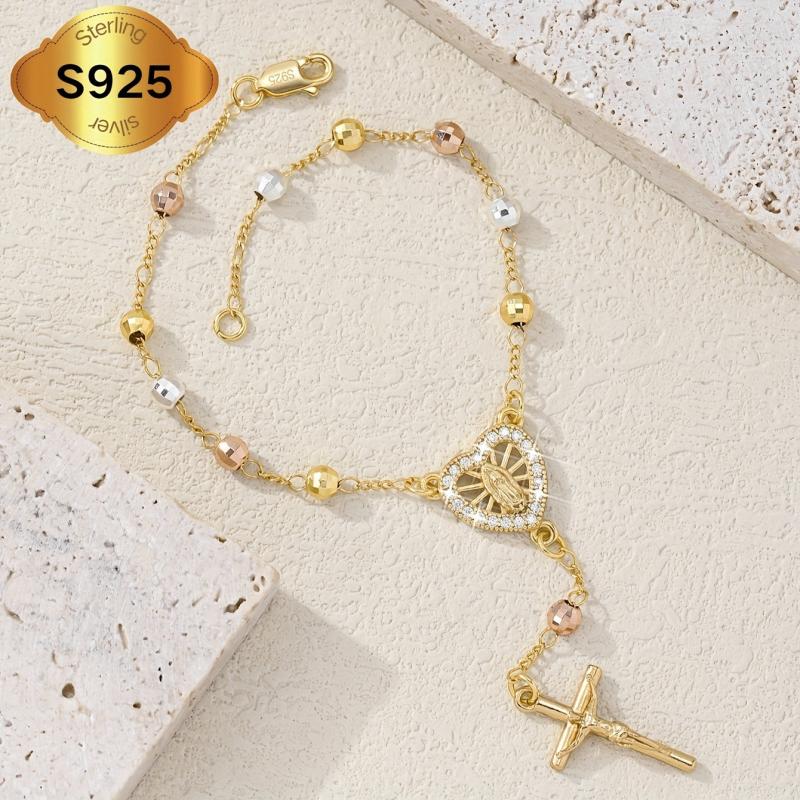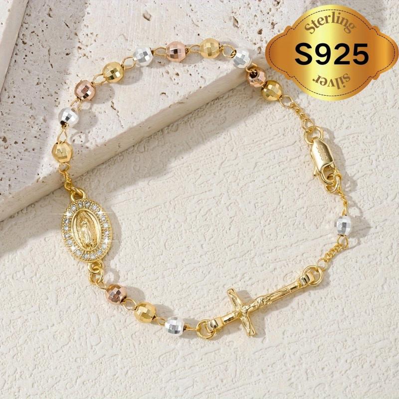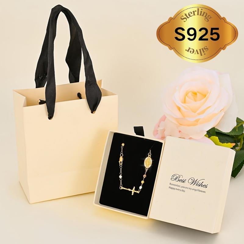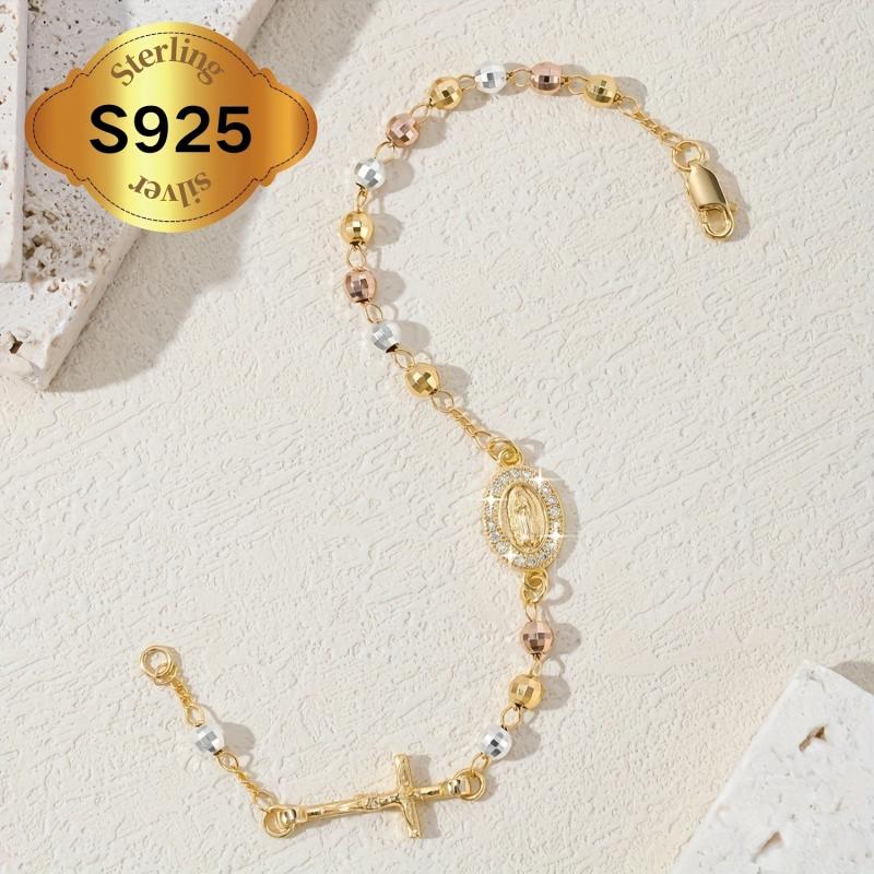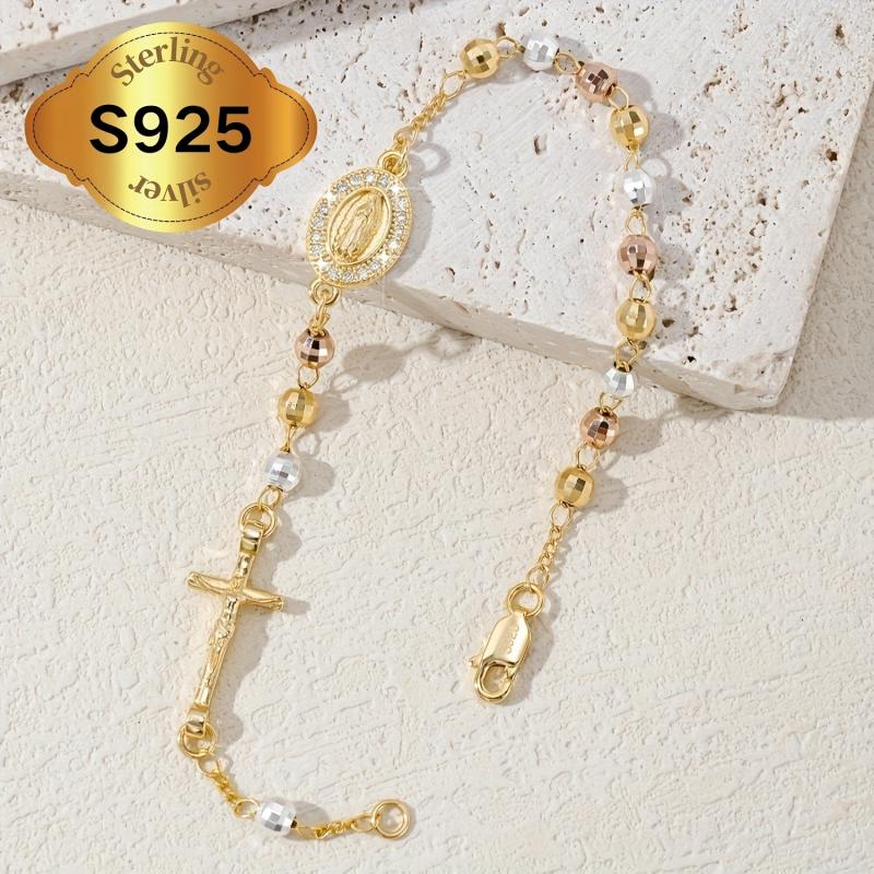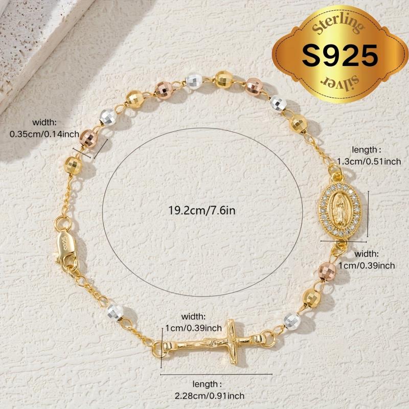 Exquisite S925 Silver bracelet with triple golden plated craftsmanship featuring handcrafted Virgin Mary Cross and Jesus rosary design. Hypoallergenic and comes with a high-quality drawer and carry bag.