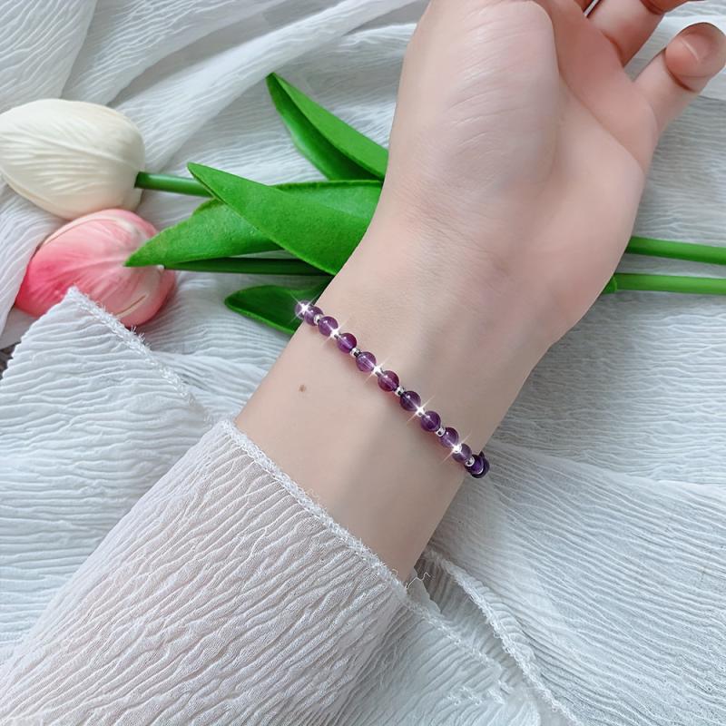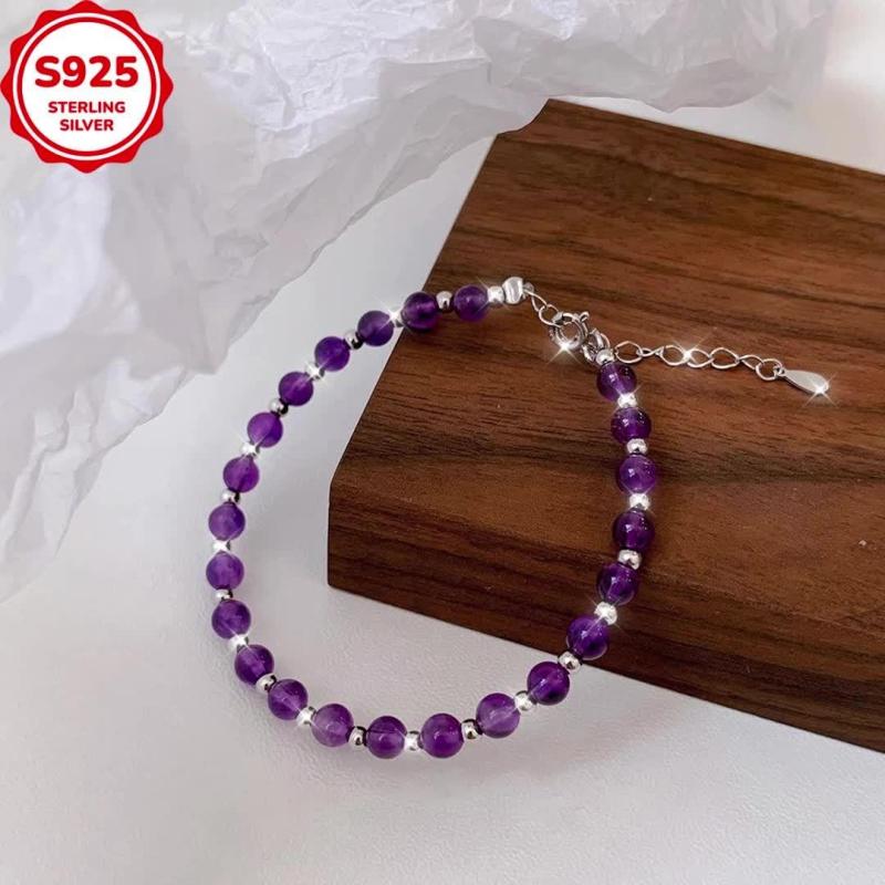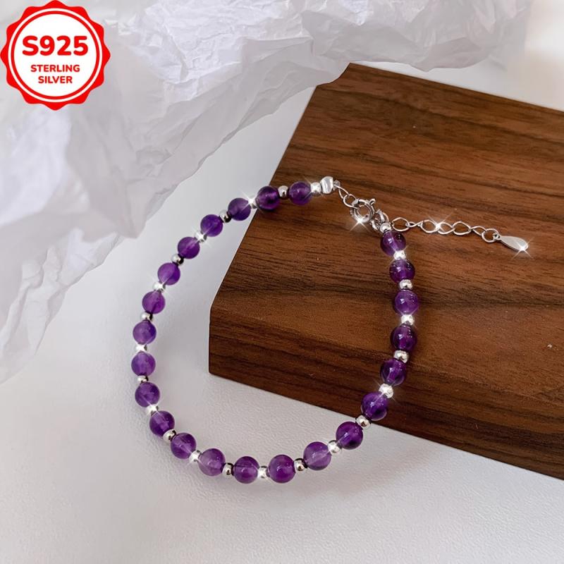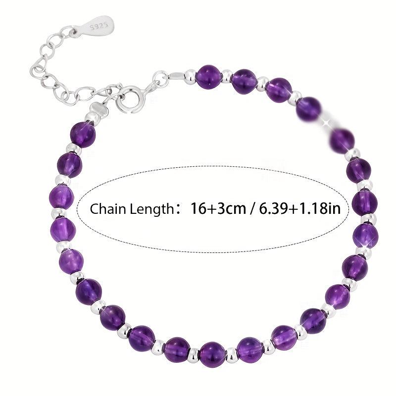 This elegant bracelet features natural amethyst beads on a sterling silver chain. It is adjustable in length and perfect for adding a touch of sophistication to any outfit.