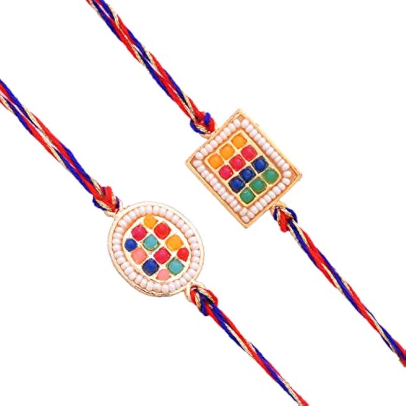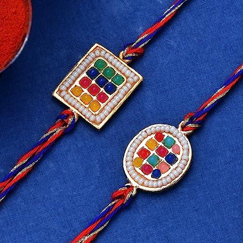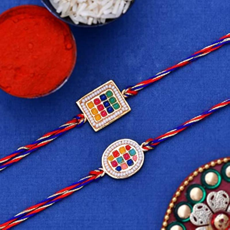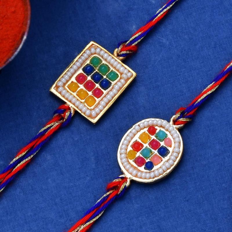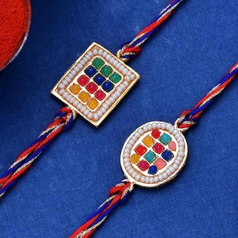 Celebrate Raksha Bandhan with this set of 2 beautifully crafted threaded rakhis adorned with beads. Perfect gift for your sibling.
