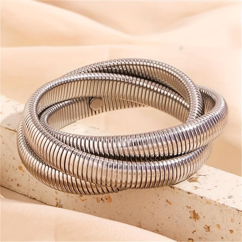 This set includes 3 bangle bracelets with snake link chain design. The flexible and stretchy bangles are fashionable and adjustable for both men and women.