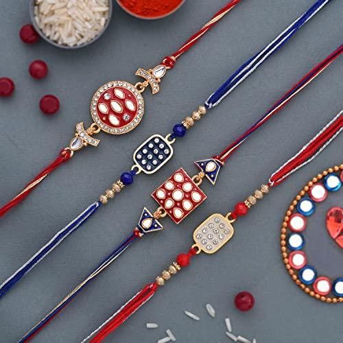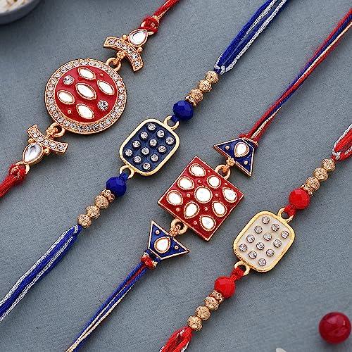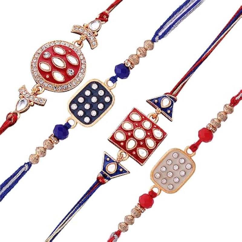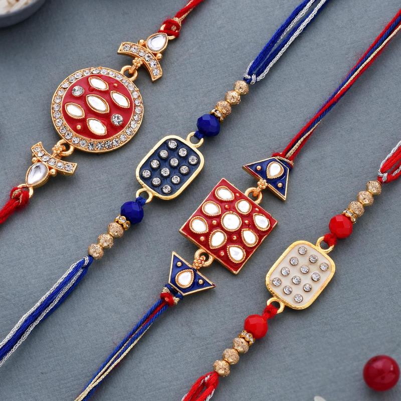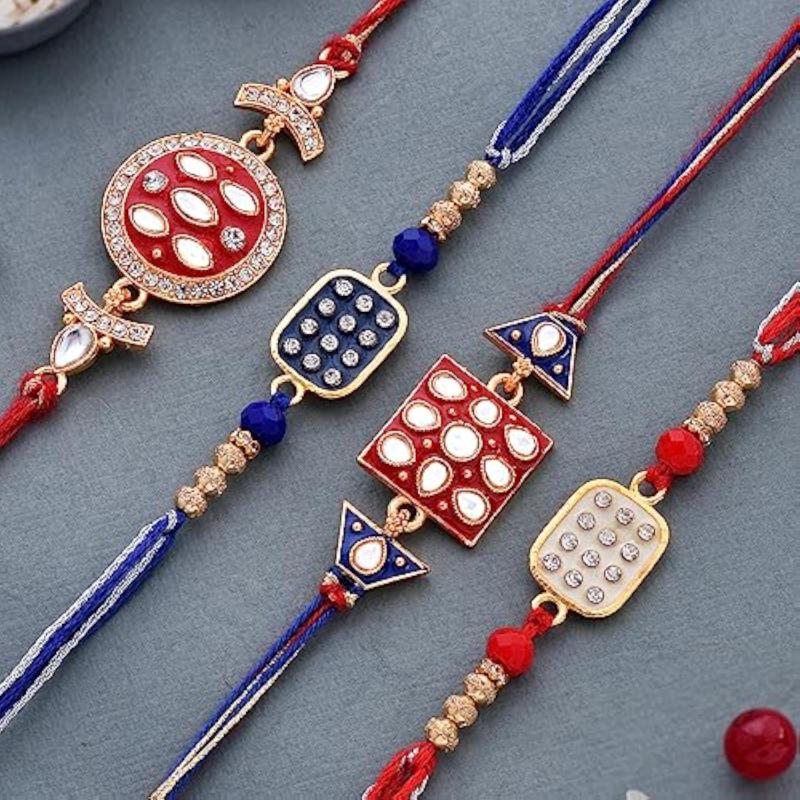 Beautiful set of 4 designer rakhis with Meenakari and Kundan work. Perfect for celebrating Raksha Bandhan.