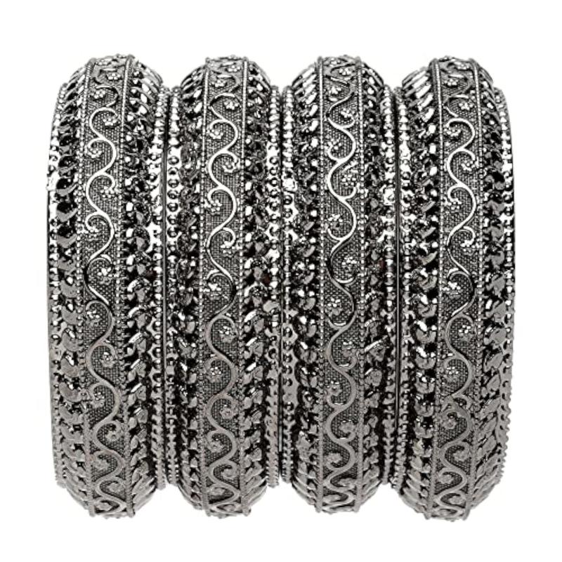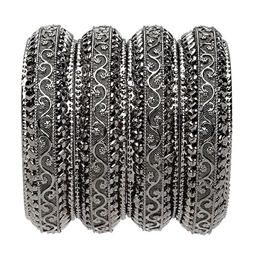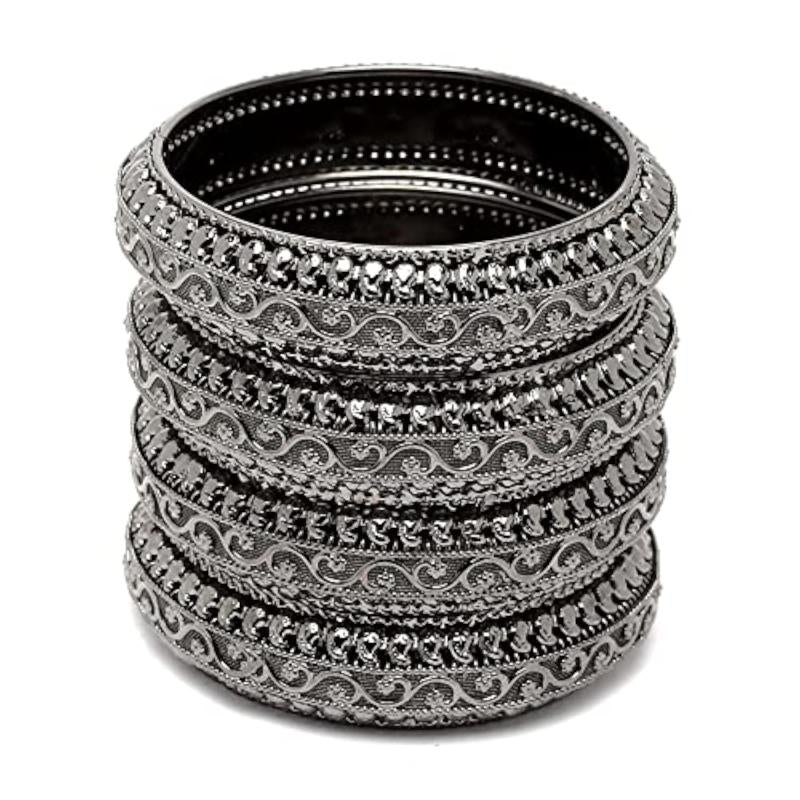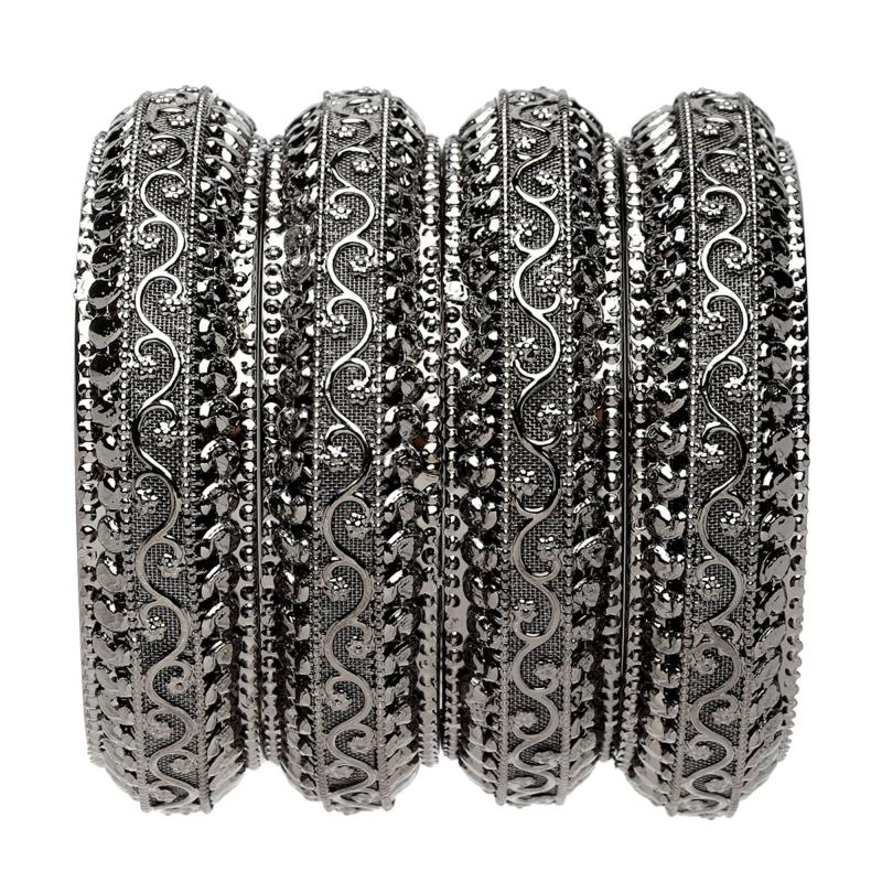 Elegant set of 4 oxidised silver-plated toned intricate textured bangles for a chic and stylish look.