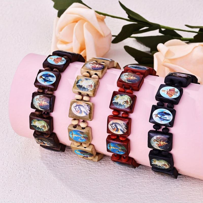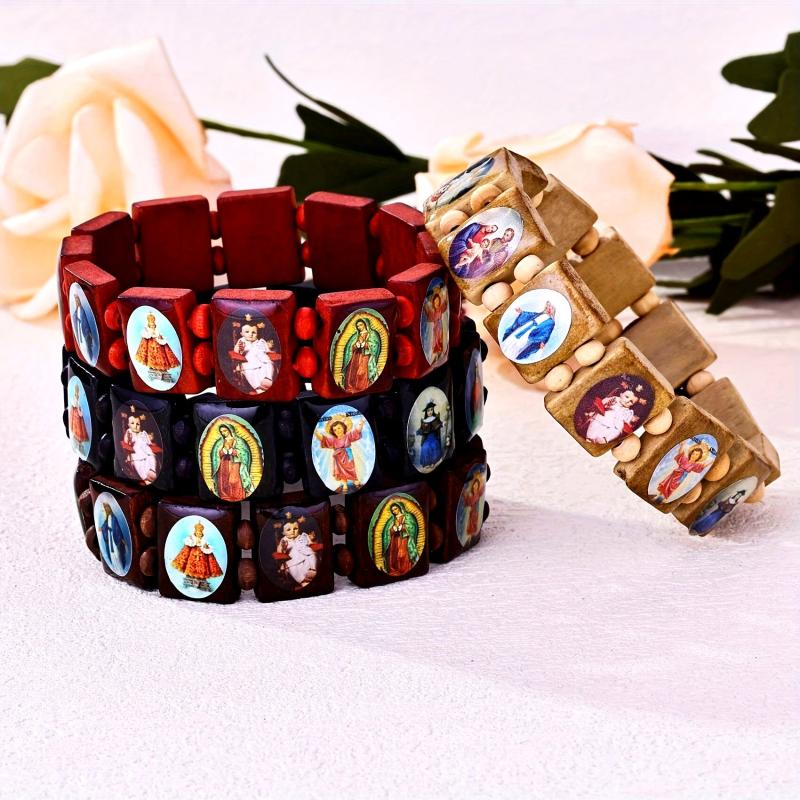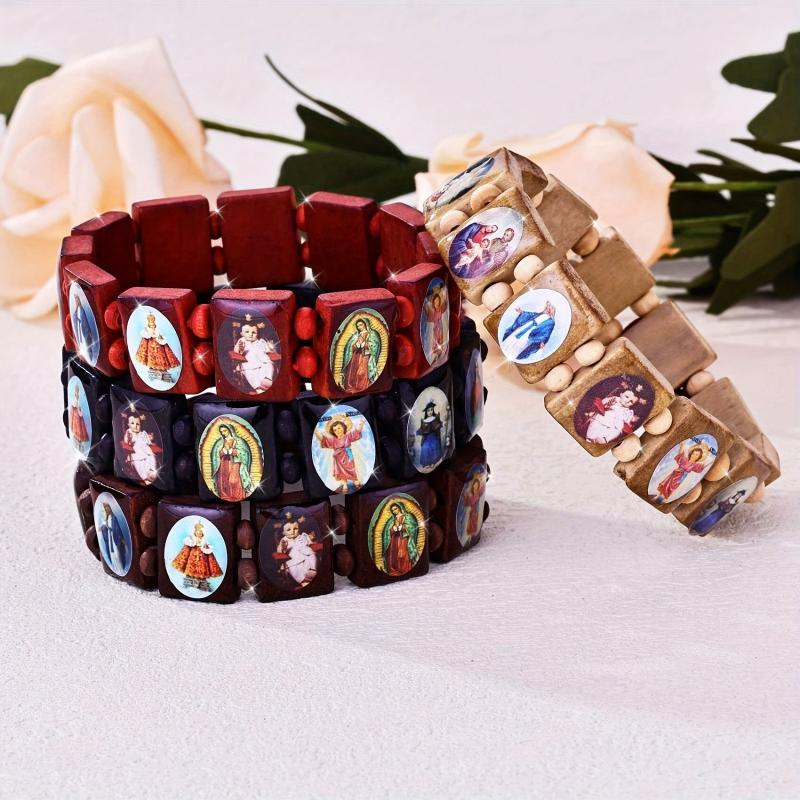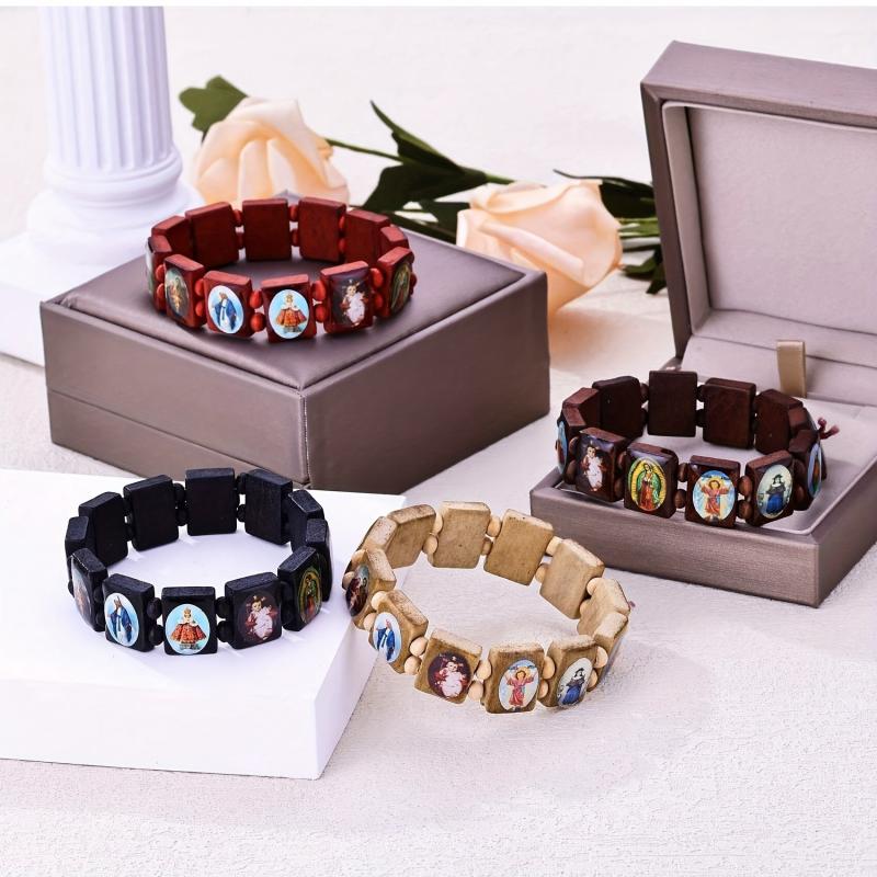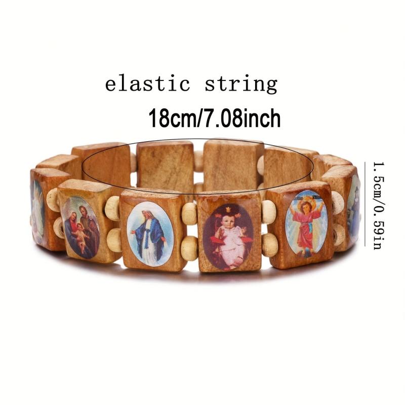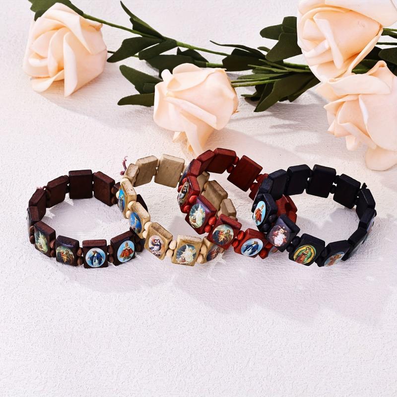 This set includes 4 elastic rope bracelets featuring the Virgin Mary, Holy Angel, Saint Judas, and other religious symbols. Made of solid wood material for a durable and stylish accessory.