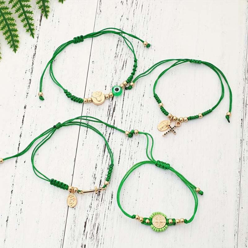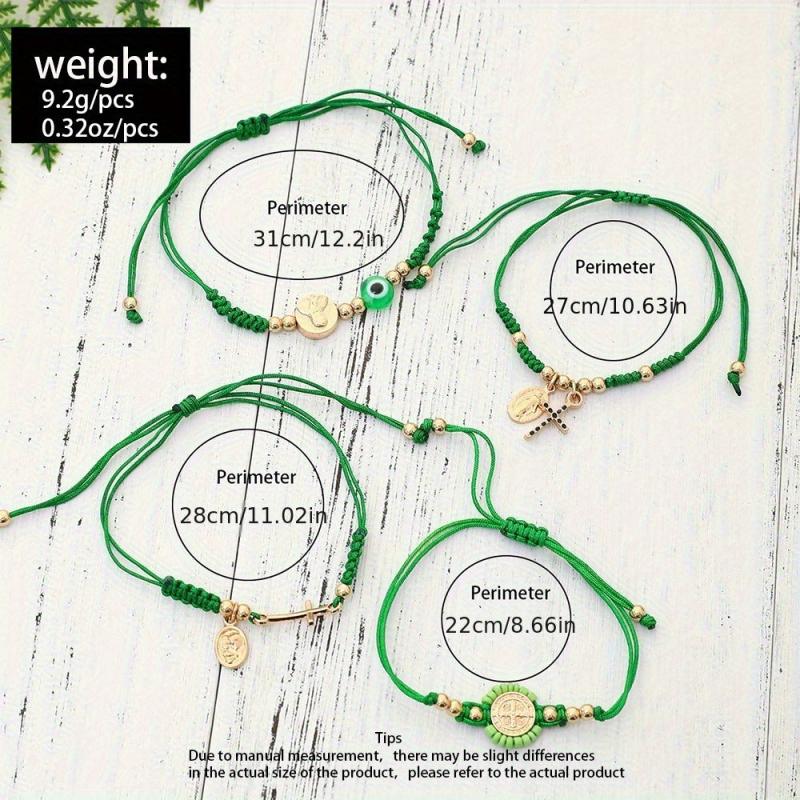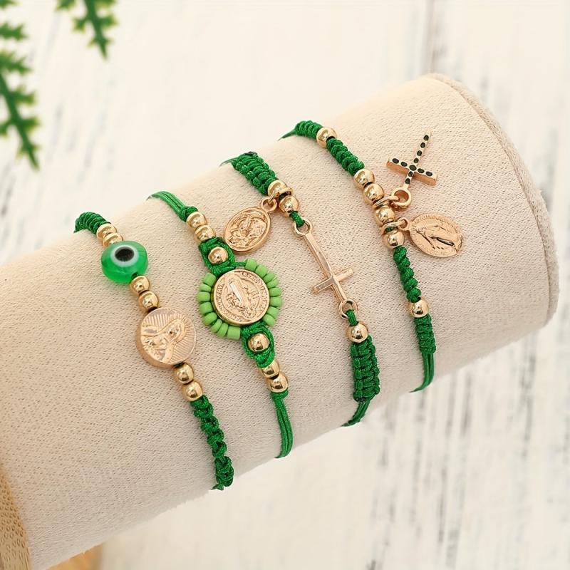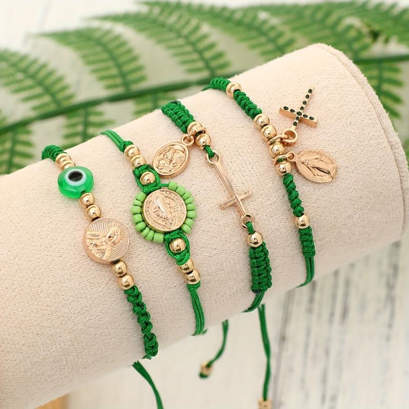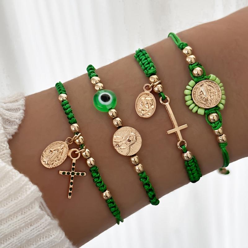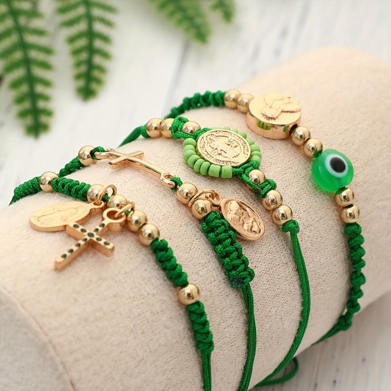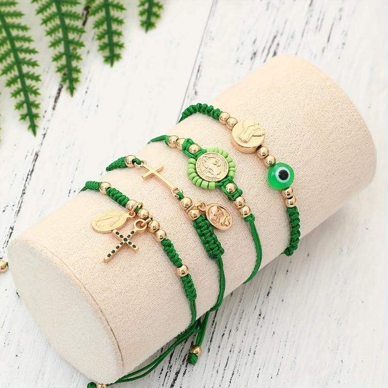 This set includes 4 woven bracelets in green tones with a retro ethnic style. Each bracelet features a Devil's Eye Cross pendant. The bracelets are adjustable with a pull string closure, making them easy to wear and great for gifting.