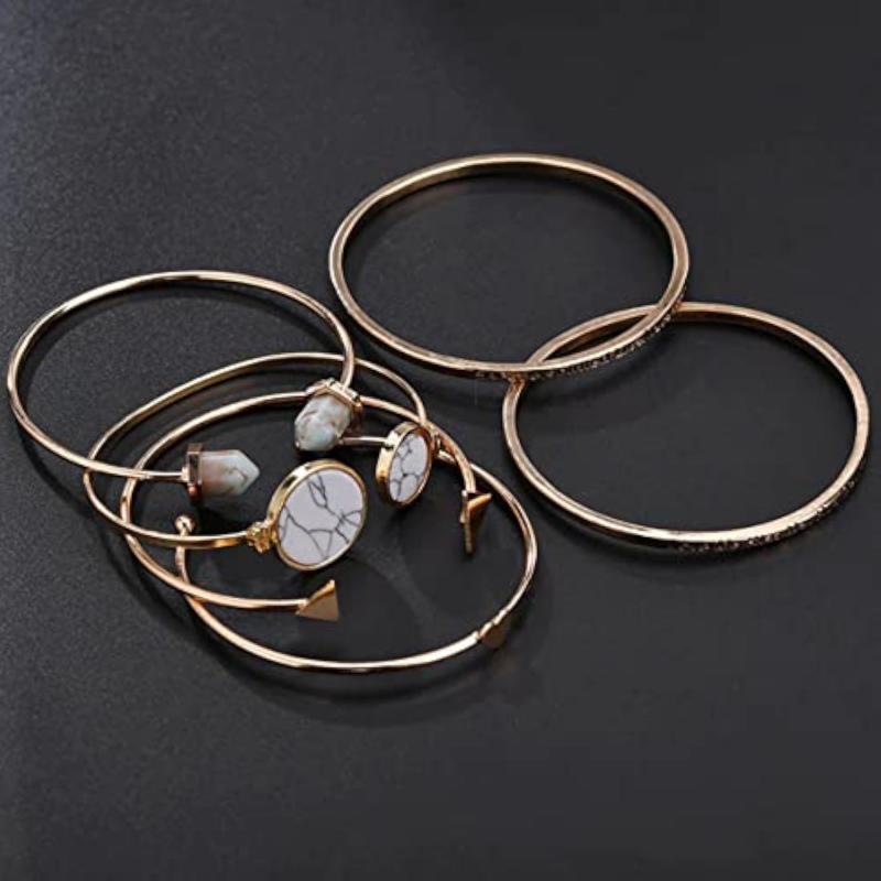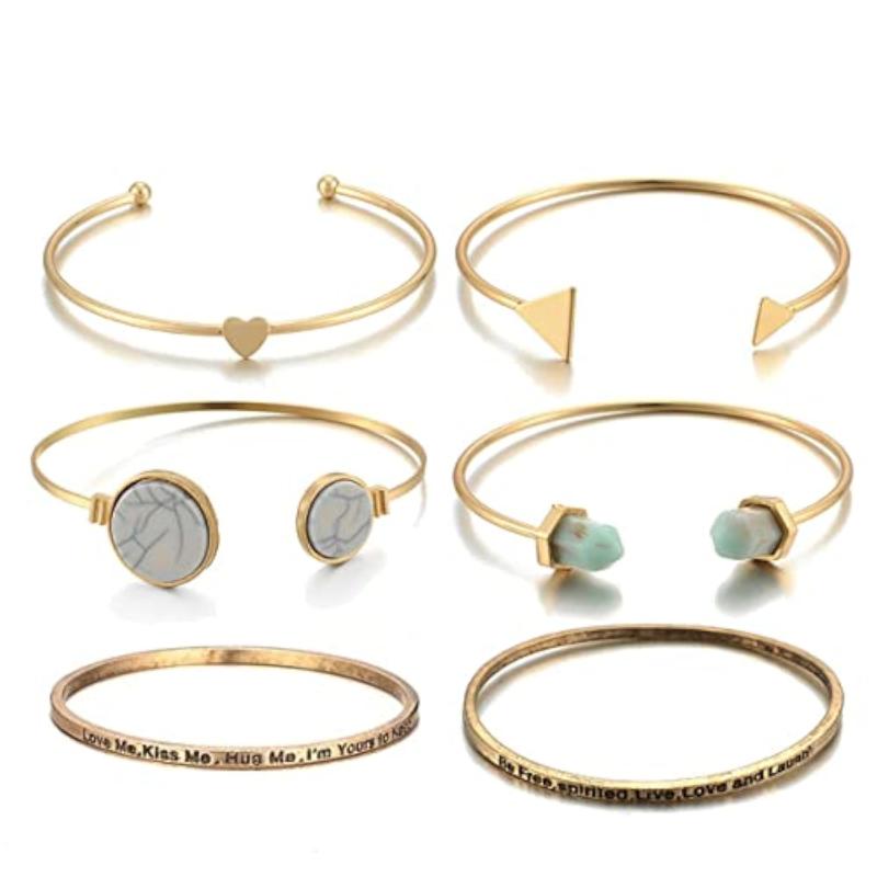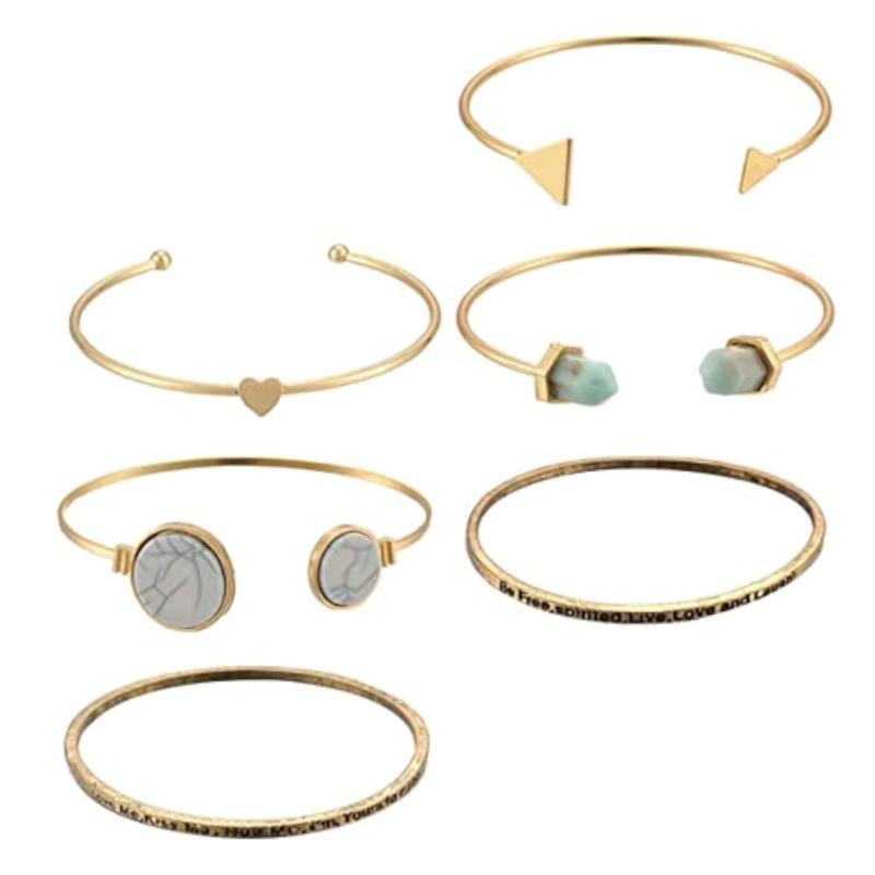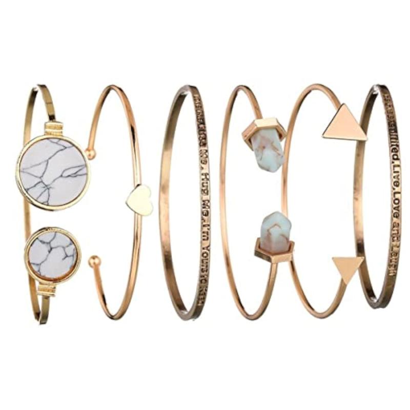 Elevate your style with this set of 6 contemporary stackable bracelets featuring inspirational quotes. These bracelets are perfect for adding a touch of positivity and style to your everyday look.