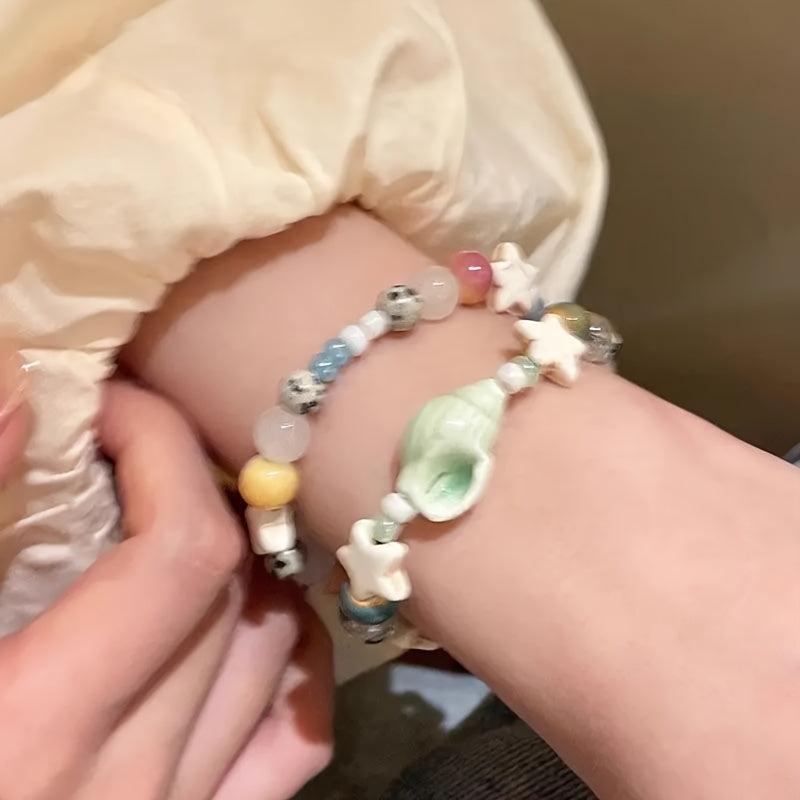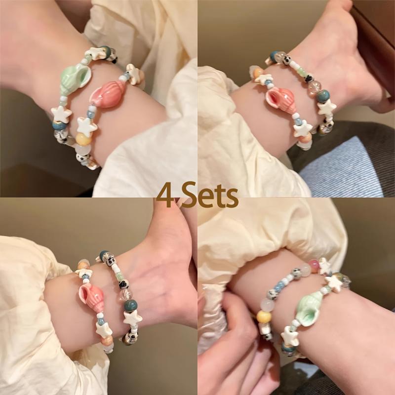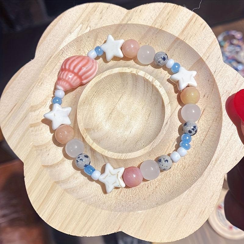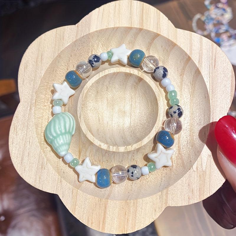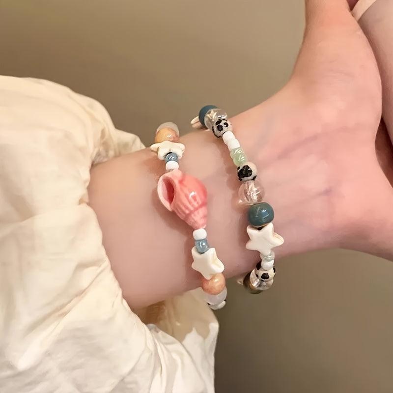 Enhance your style with this set of 8 vacation-themed ceramic bead bracelets that feature conch and star designs, offering a unique and stylish accessory for women with high appeal.