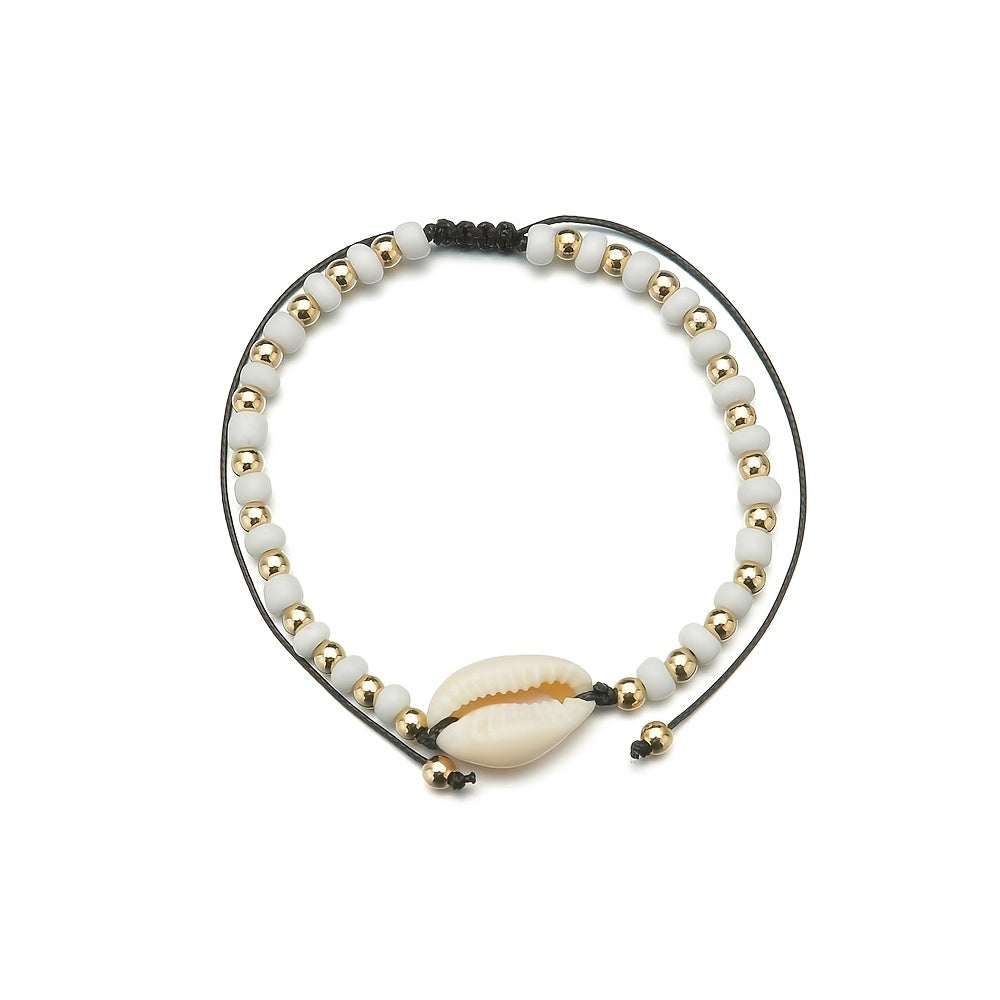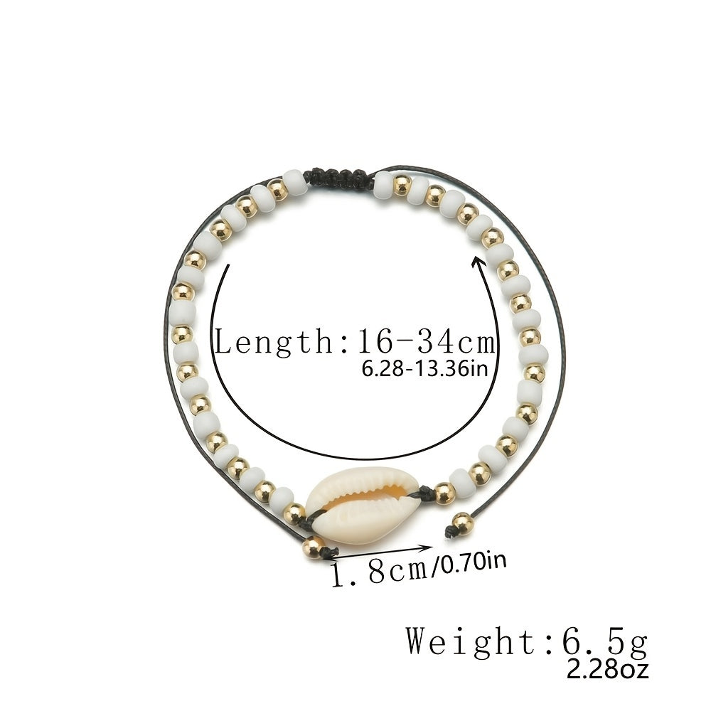 Stay stylish with this summer beach style ankle bracelet featuring shell and golden beads. Perfect for a day at the beach or any casual outfit.