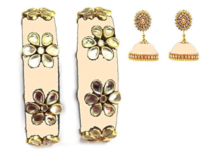 Beautiful set of 2 silk bangles adorned with kundans. Comes with matching earrings/jhumkas in size 2/10.