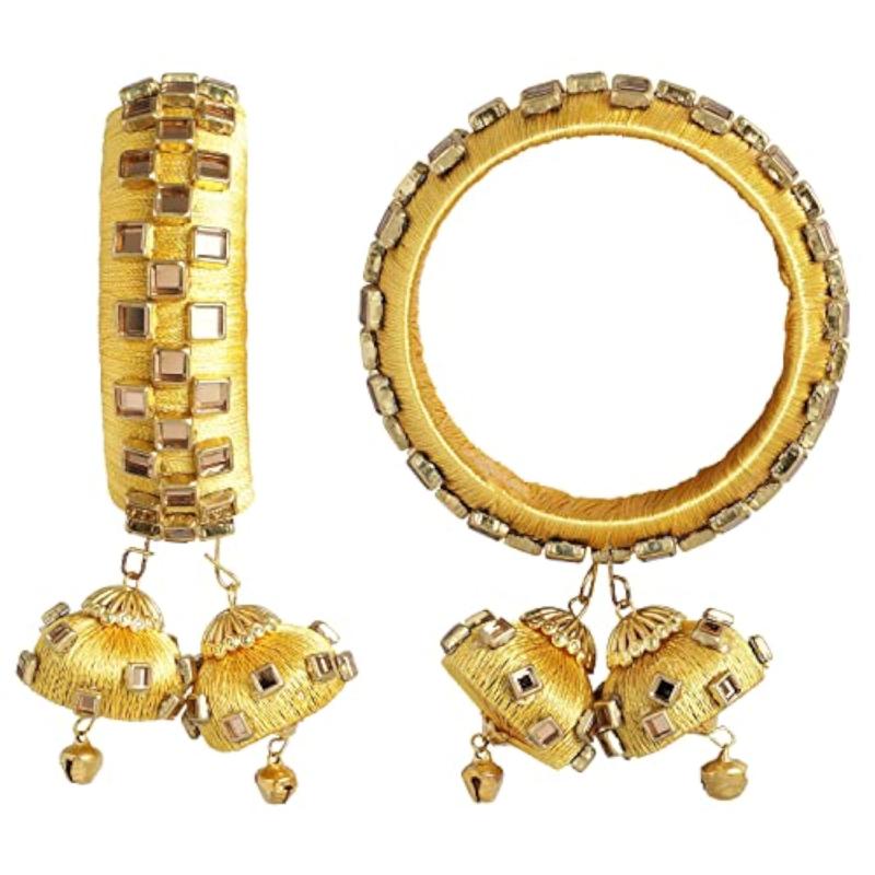 Elegant and vibrant silk thread bangle set with crystal embellishments and dangling jhumki. Perfect for traditional occasions.