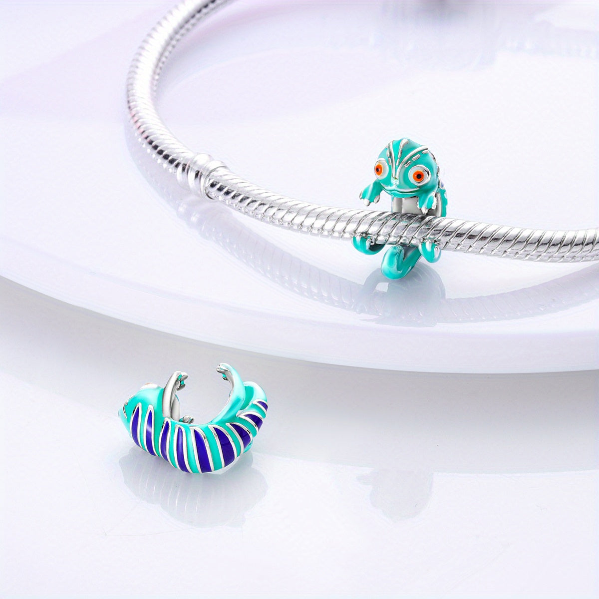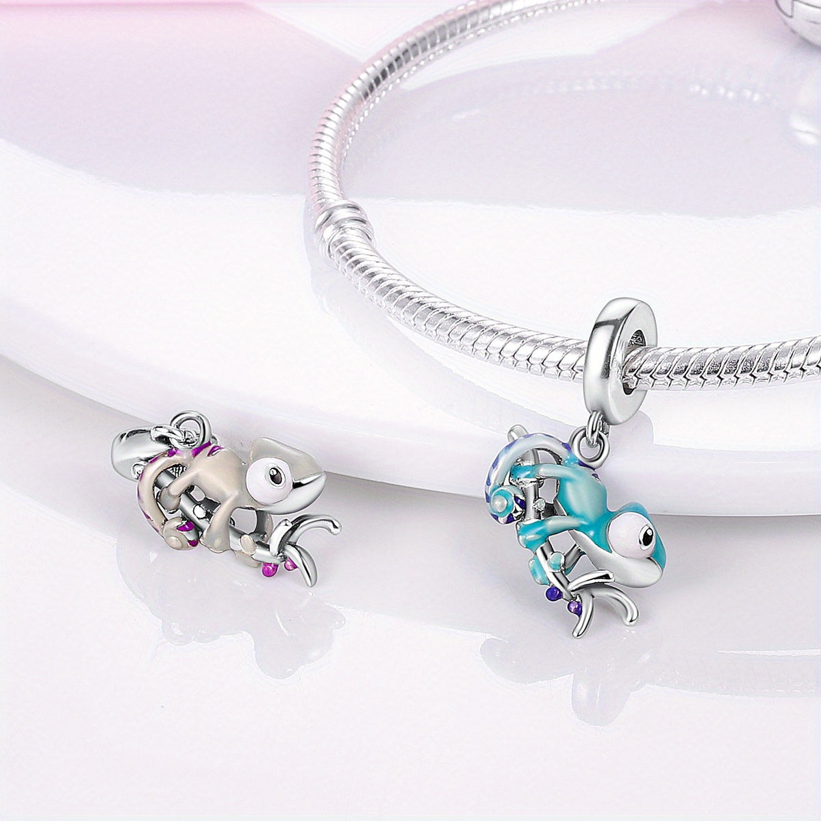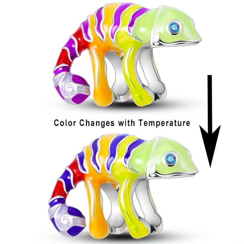 This silver plated chameleon dangle charm features temperature changing properties to add a unique touch to your DIY jewelry creations. Fits chain bracelets.