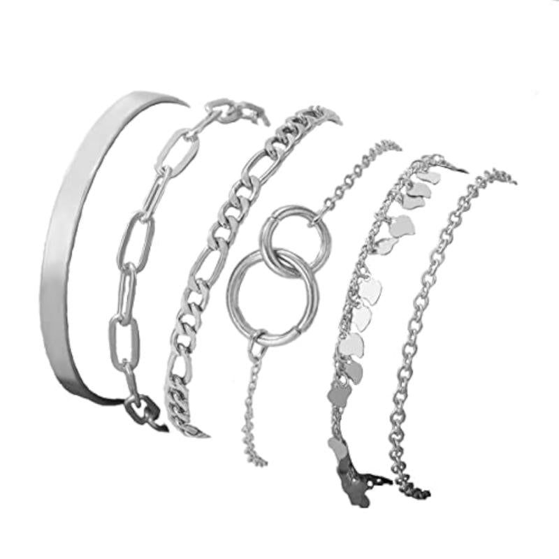 This contemporary stackable bracelet set includes 6 silver-toned bracelets, making it a versatile accessory for any occasion.