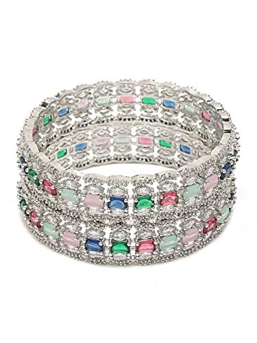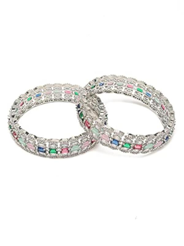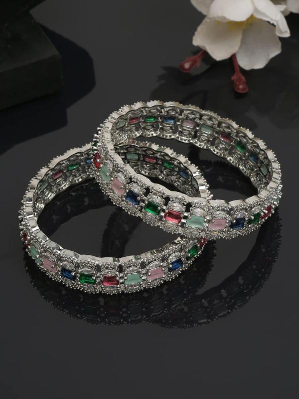 Enhance your style with these elegant silver plated bangles featuring colorful stone studs. Perfect for casual and formal occasions.