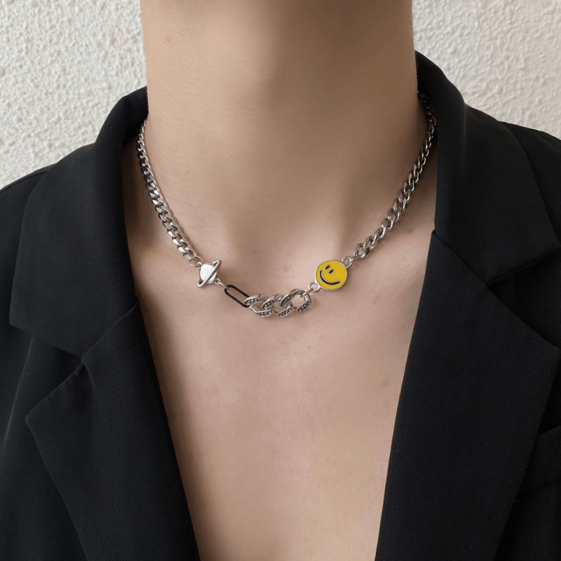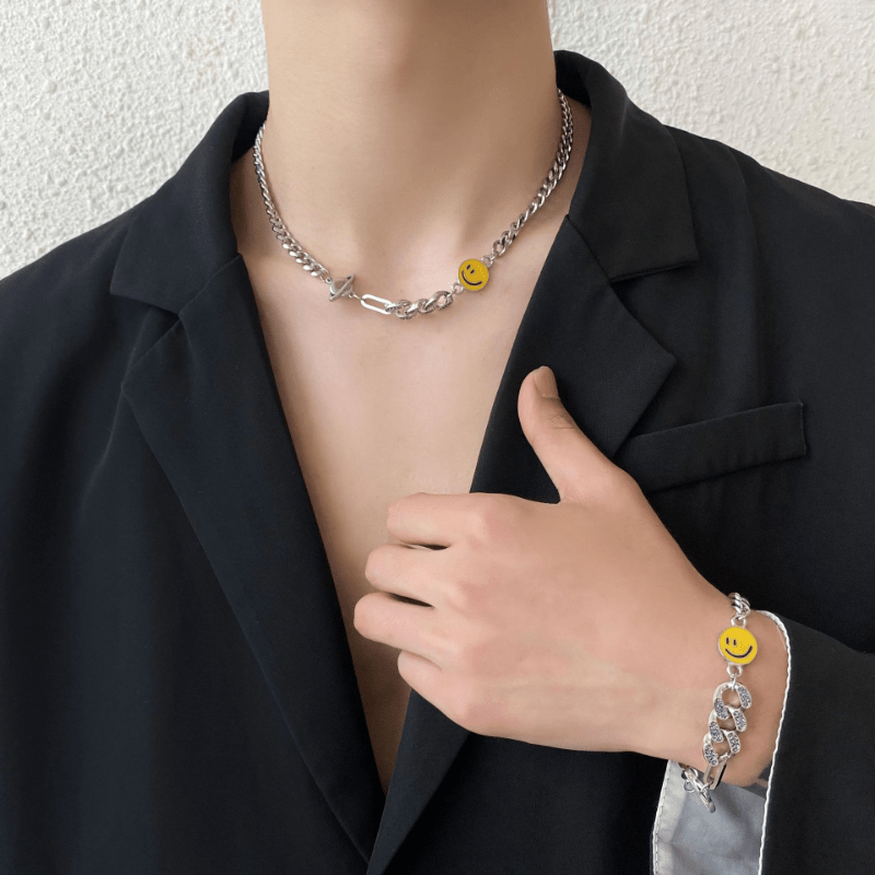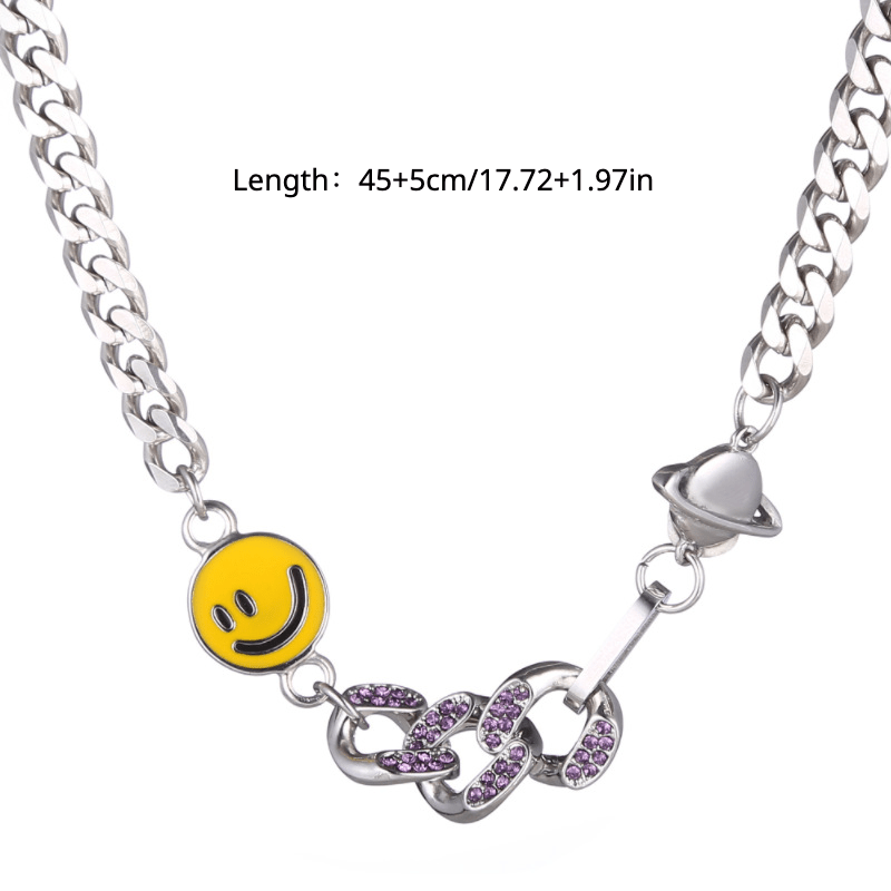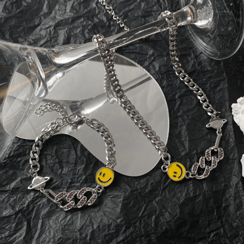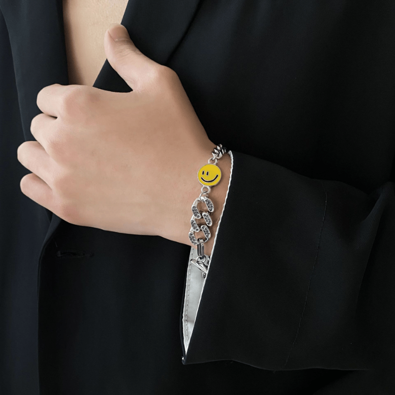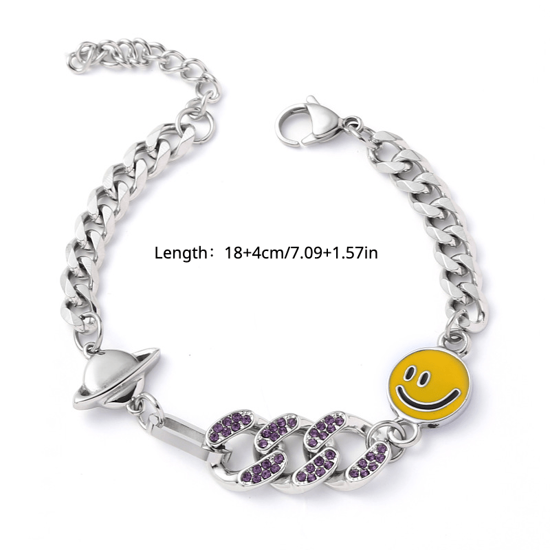 This stylish bracelet features a smiley face and planet design with faux diamond inlays. It is made of titanium steel and suitable for both men and women.