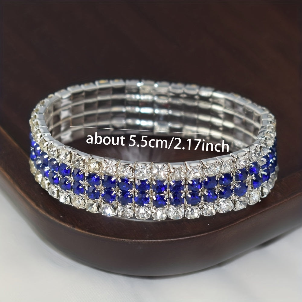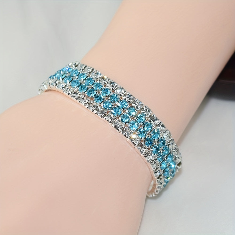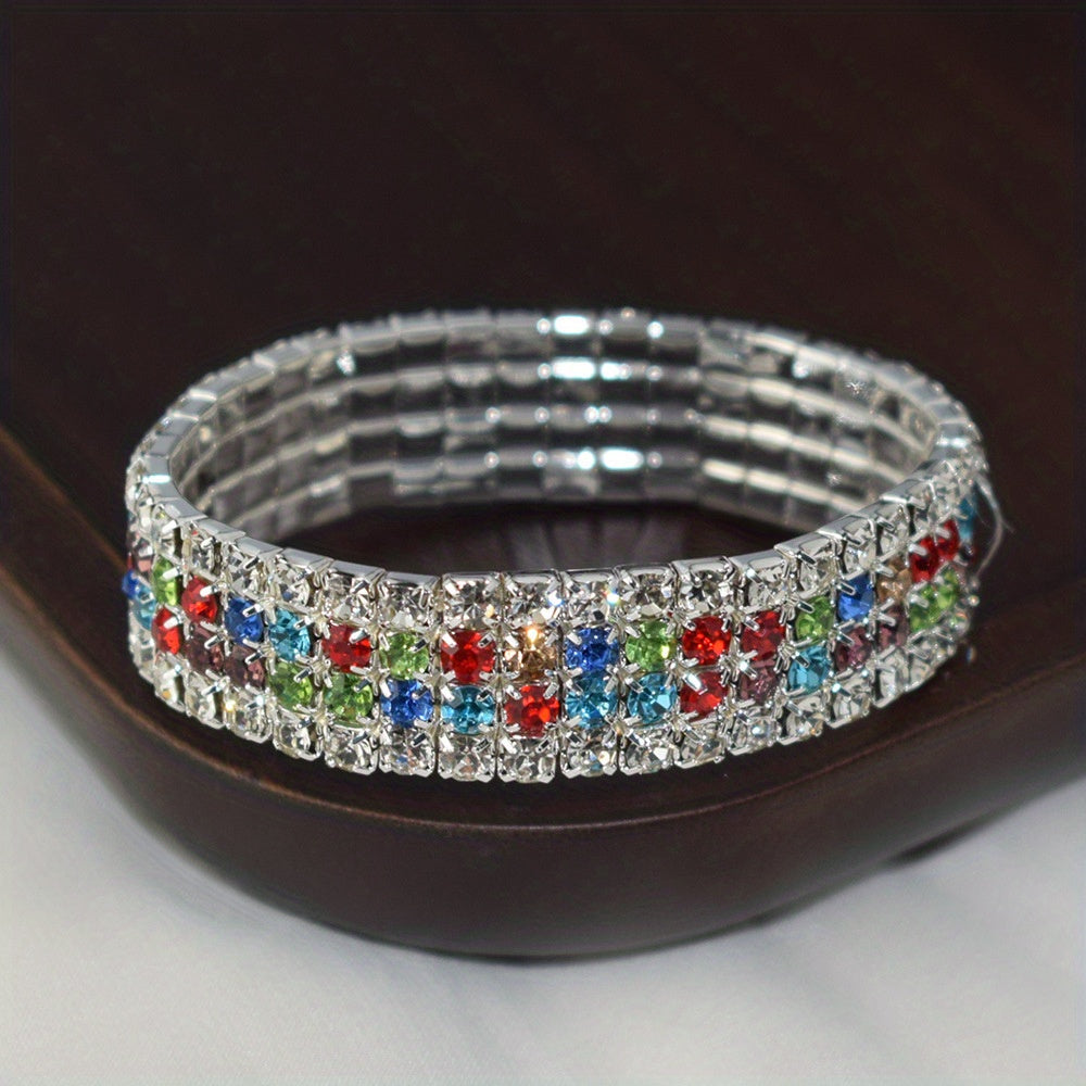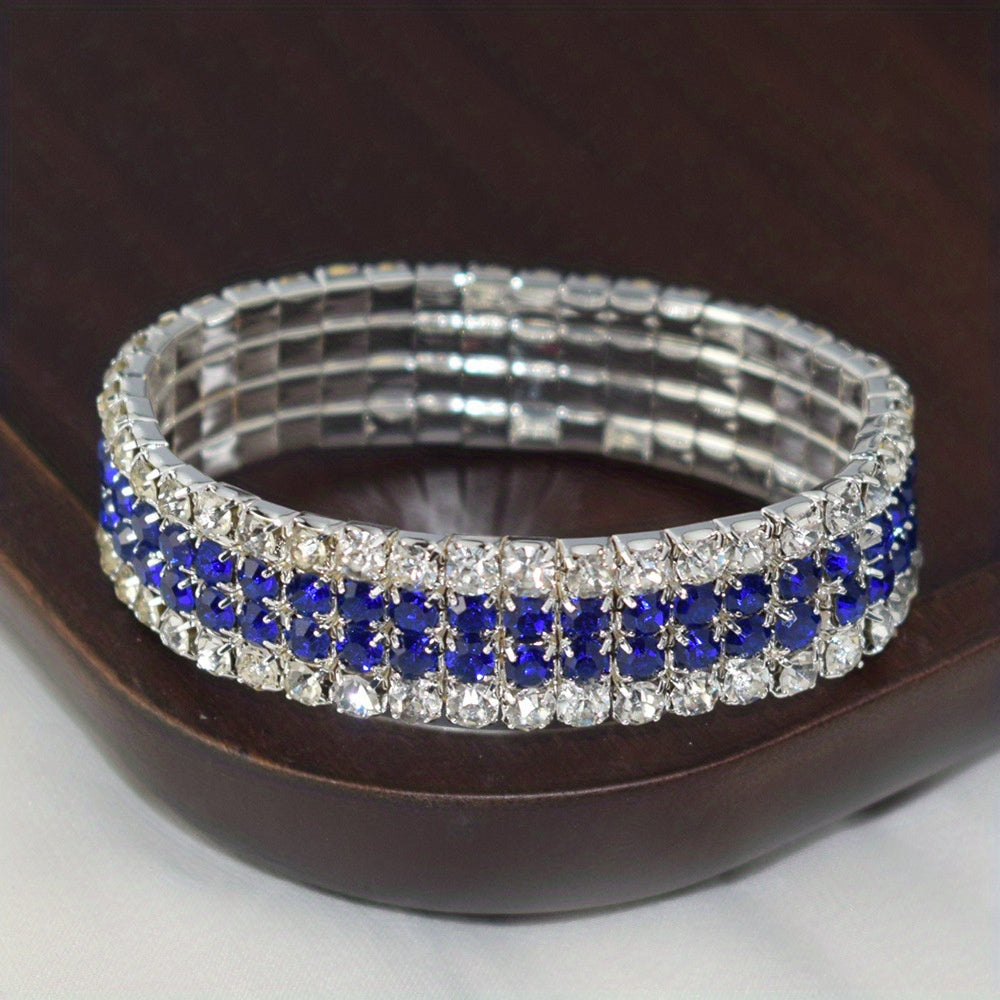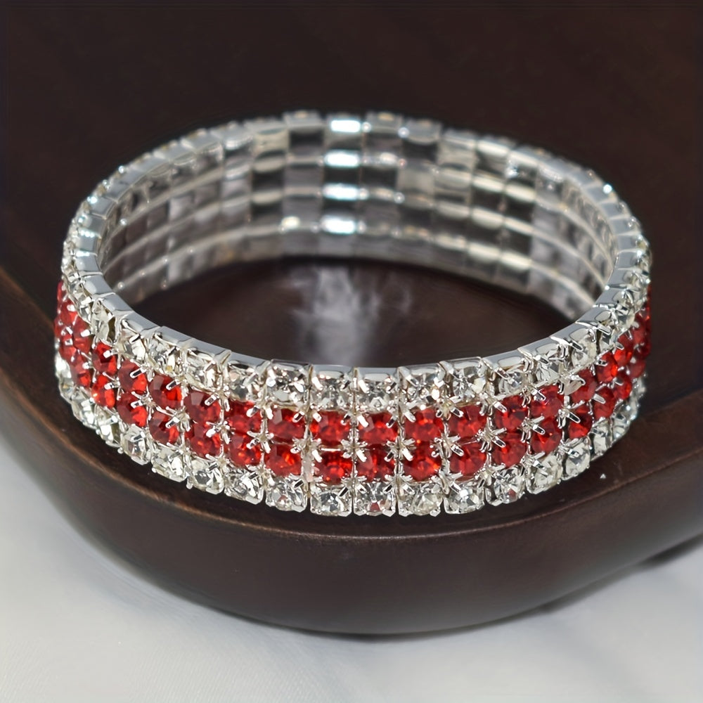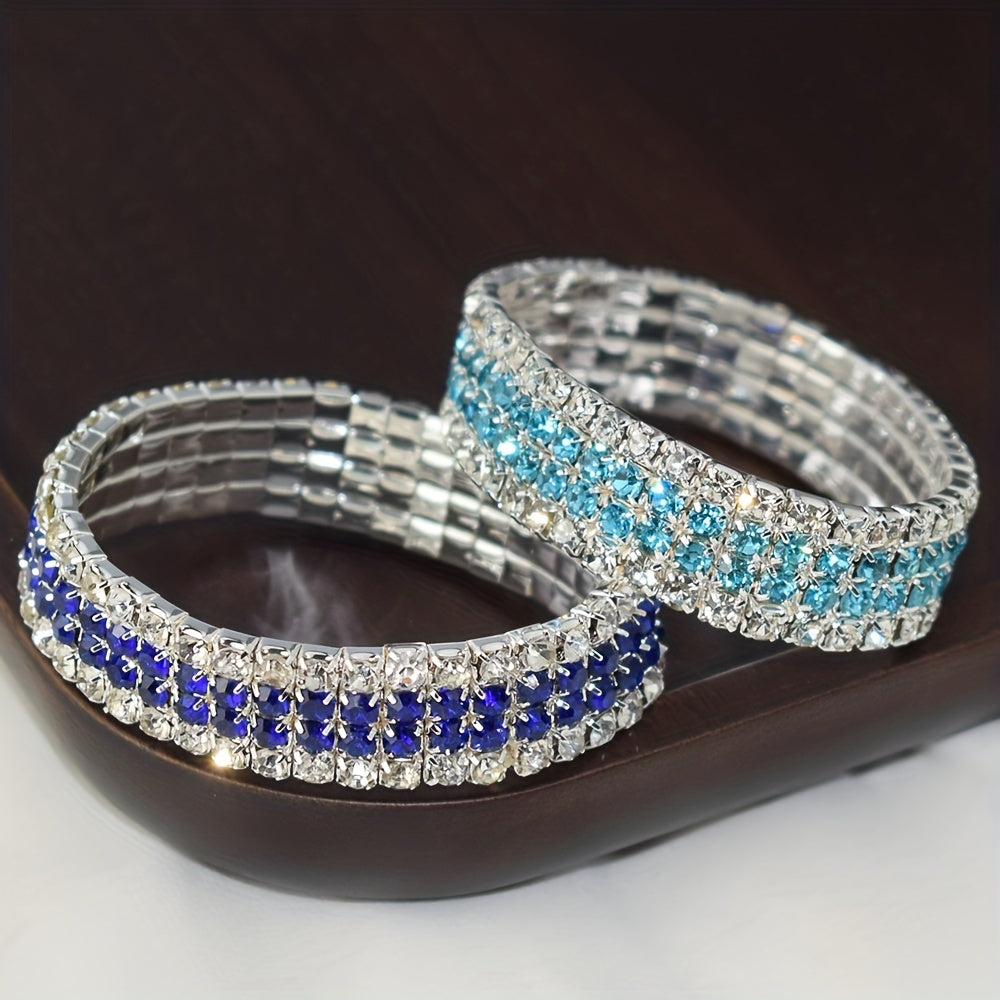 Glamorous and elegant, this elastic bangle features four rows of sparkling rhinestones. Perfect for dinner parties, weddings, or any special occasion.