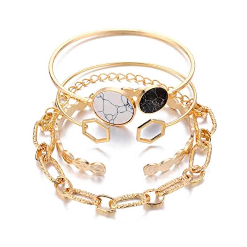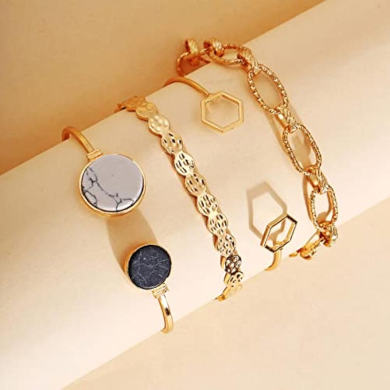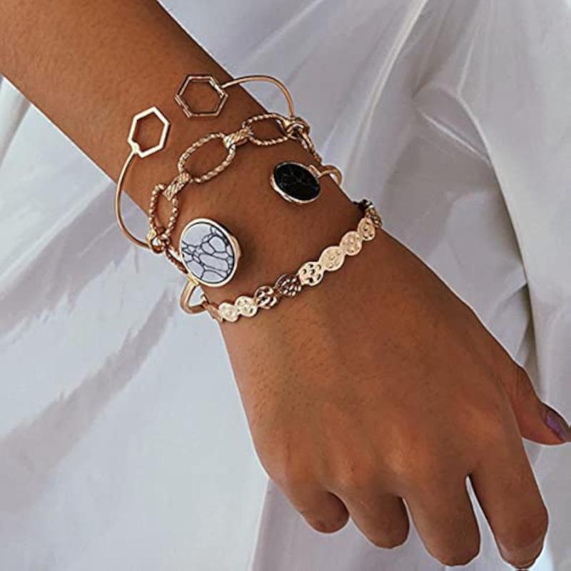 Elevate your style with this set of 4 stackable bracelets featuring a plated geometric design. Perfect for any occasion.