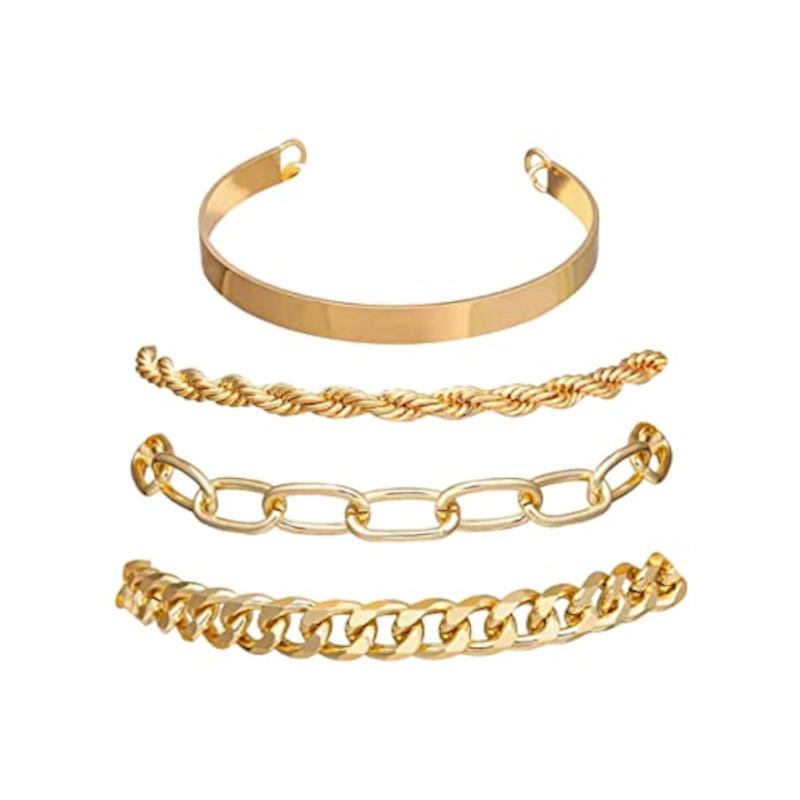 Elevate your style with this set of 4 stackable bracelets featuring a sleek gold plated design. Perfect for adding a touch of elegance to any outfit.