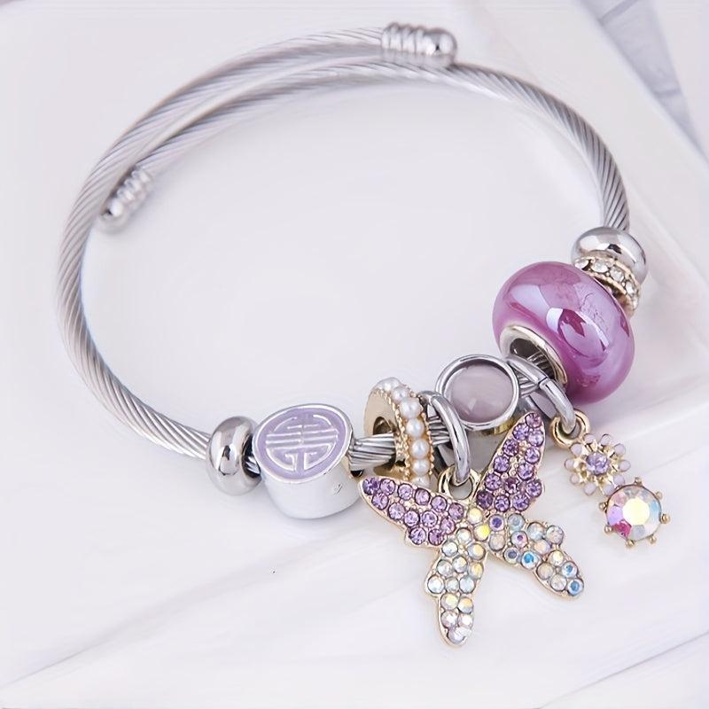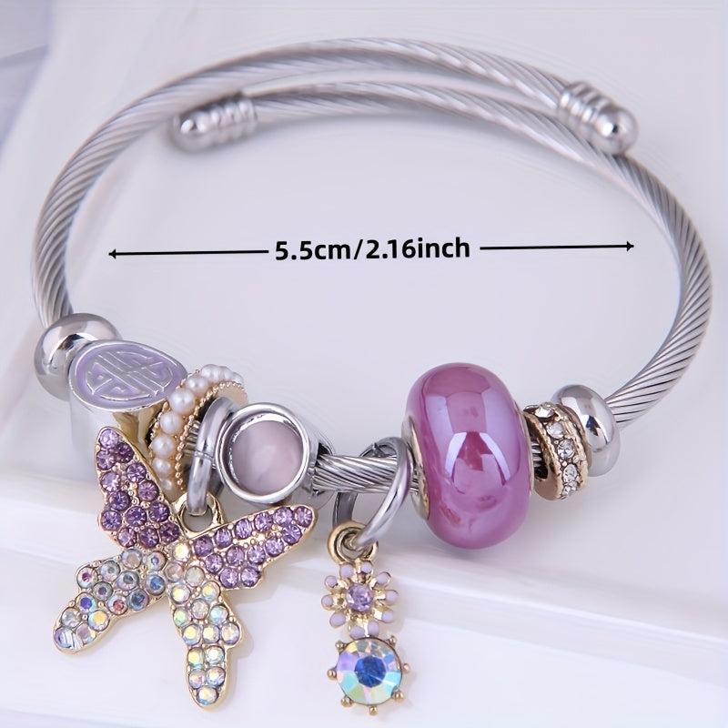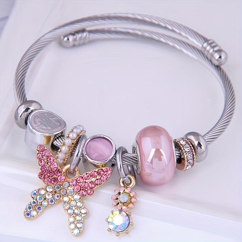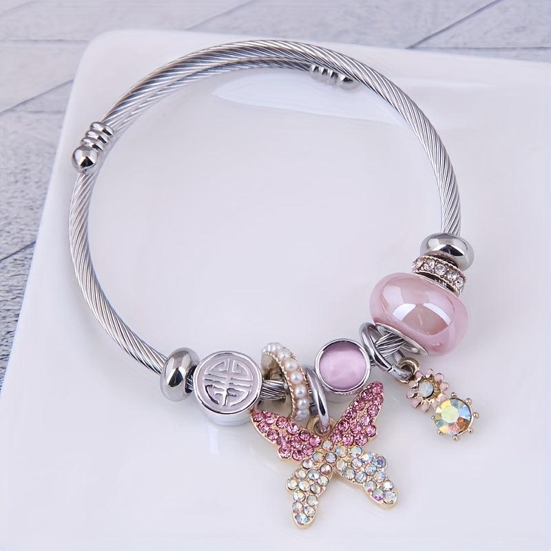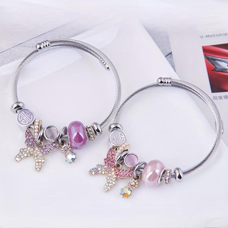 Elegant and versatile stainless steel bracelet featuring a butterfly and pearl design with rhinestone accents. Perfect for daily wear or special occasions.