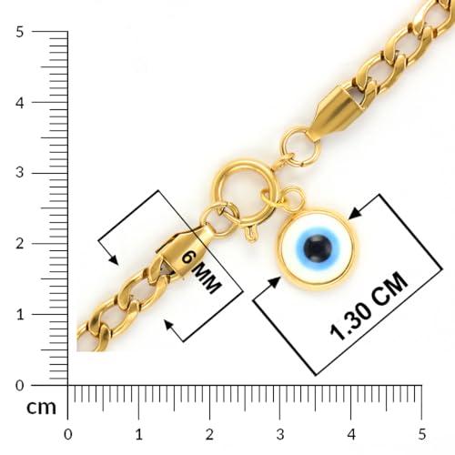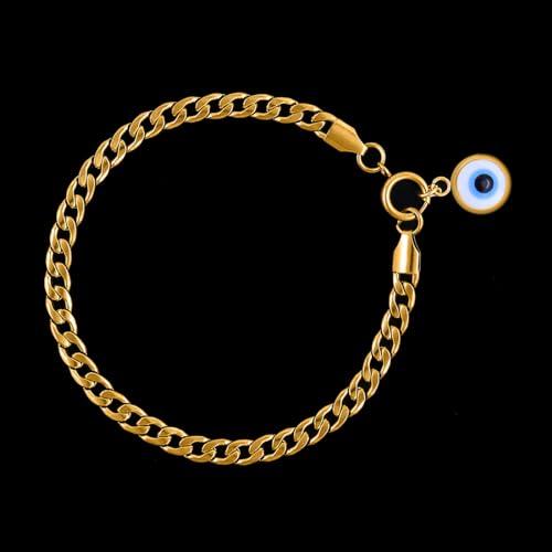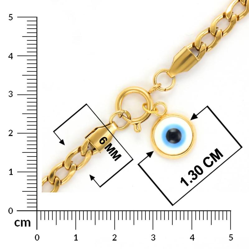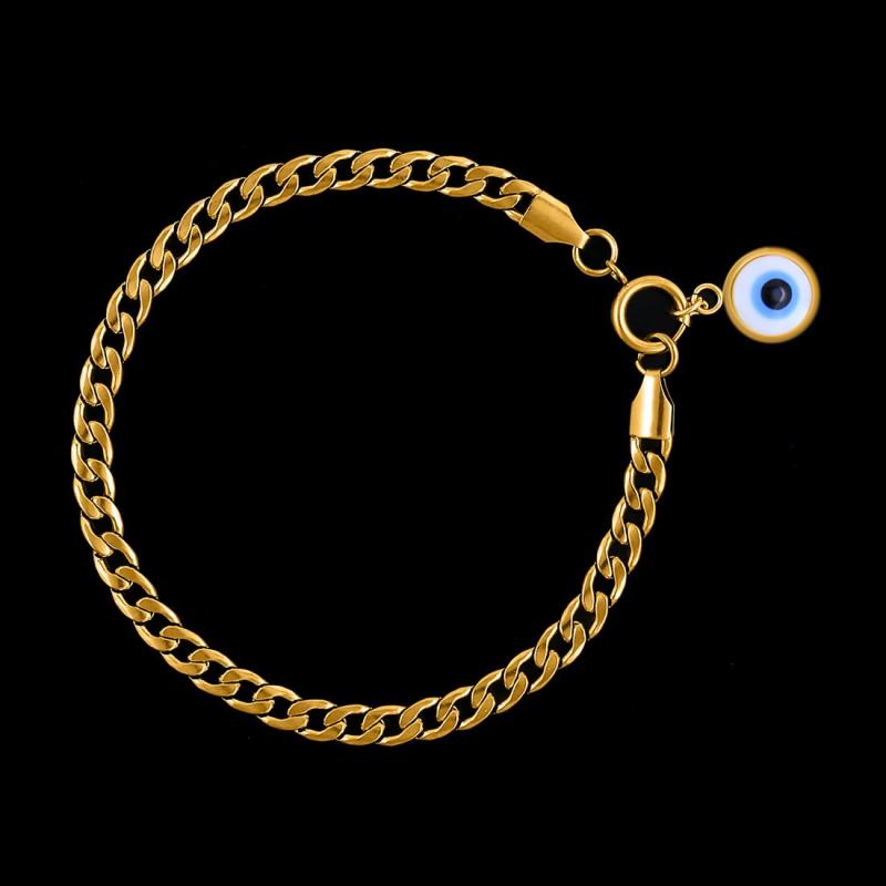 Plated stainless steel chain wrist bracelet featuring an evil eye design.