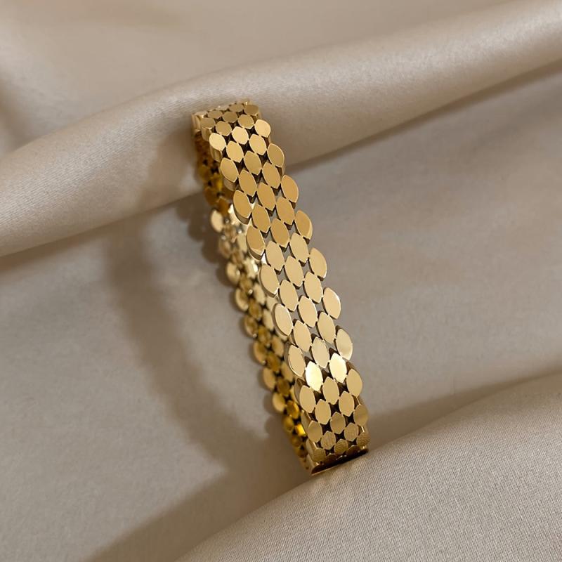 This stylish bangle bracelet is made of stainless steel with a golden finish. It is waterproof and perfect for both men and women.