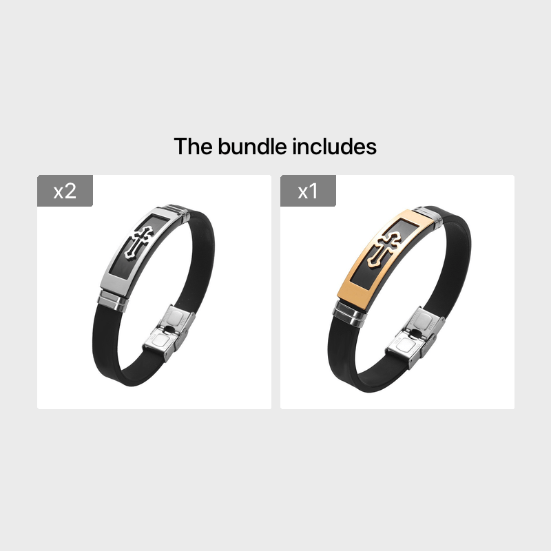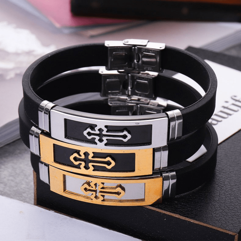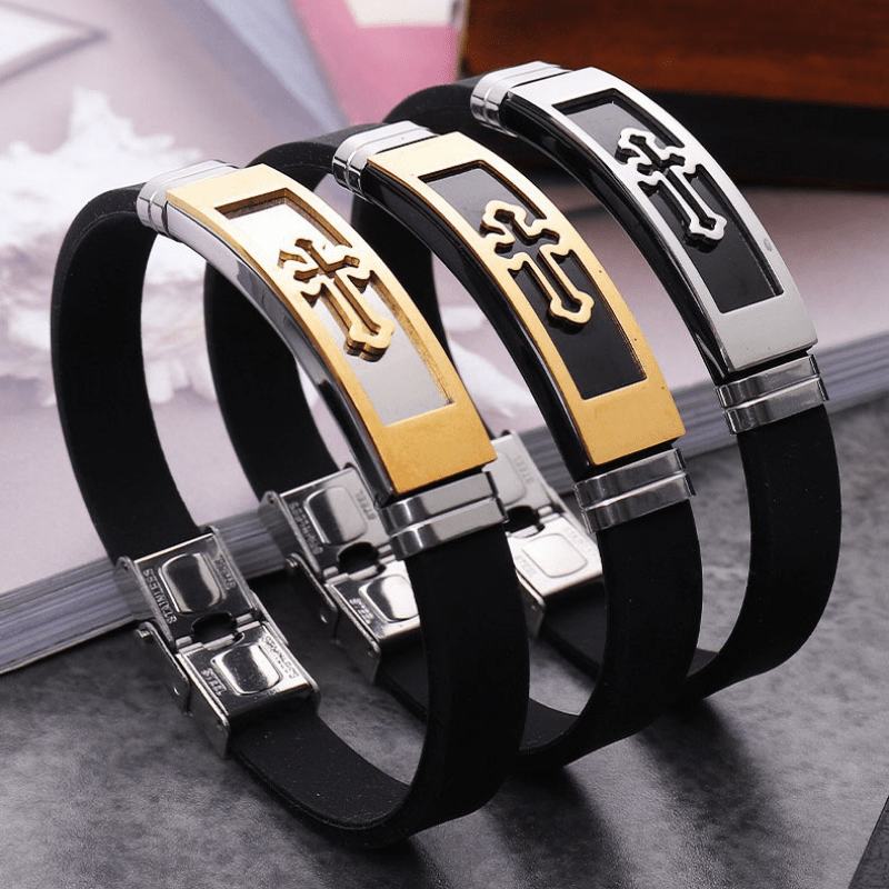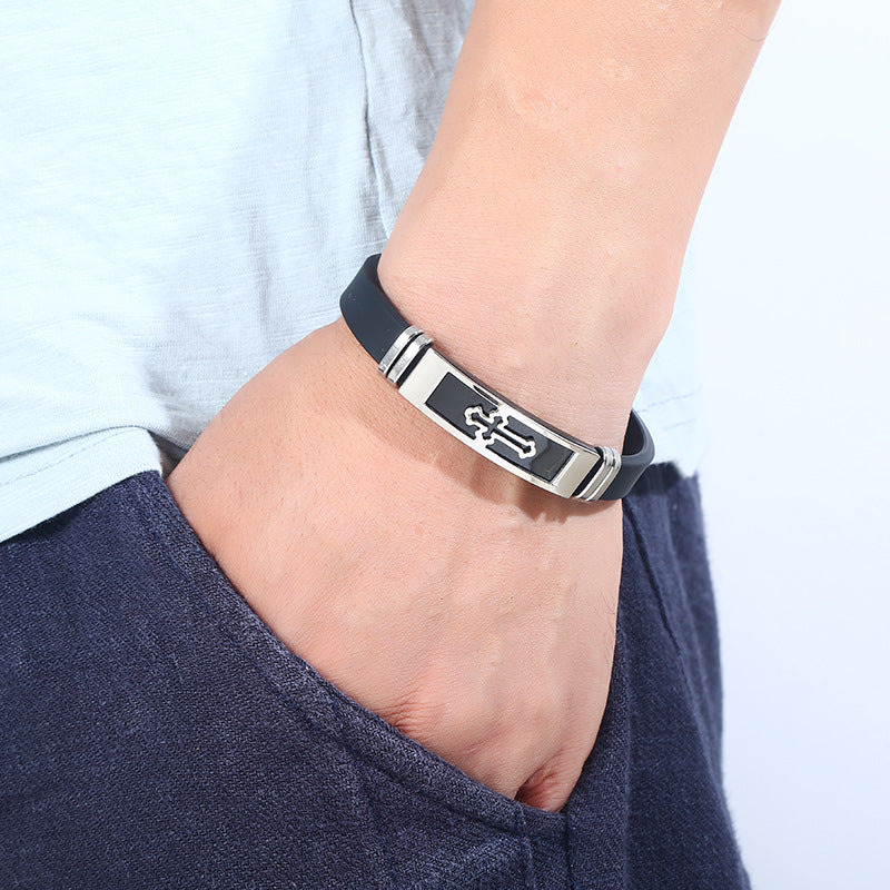 This stylish bracelet features a hollow cross design, made of stainless steel and silicone. It is a durable and fashionable accessory for both men and women.