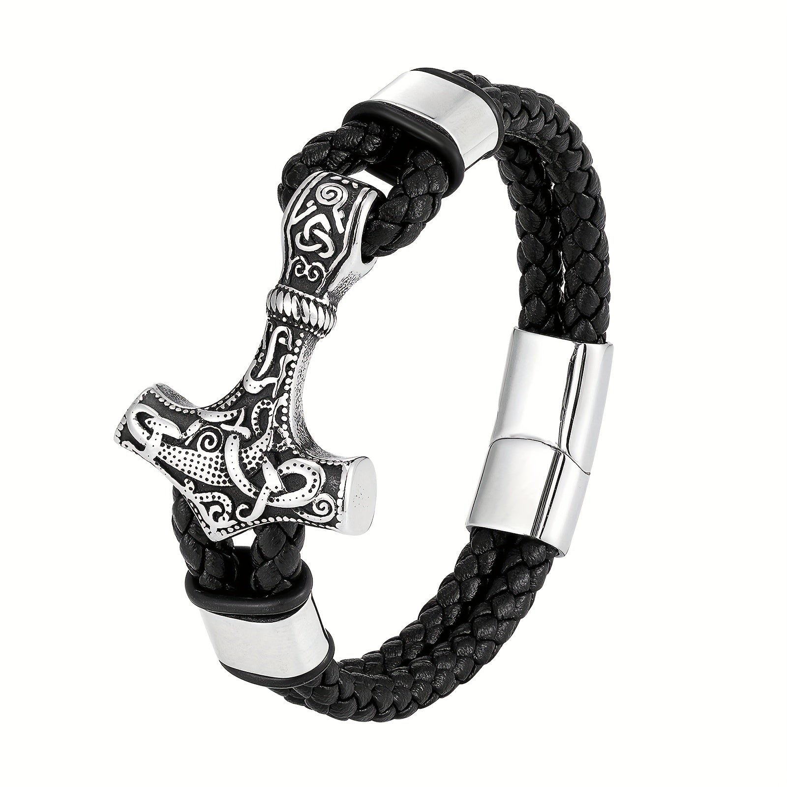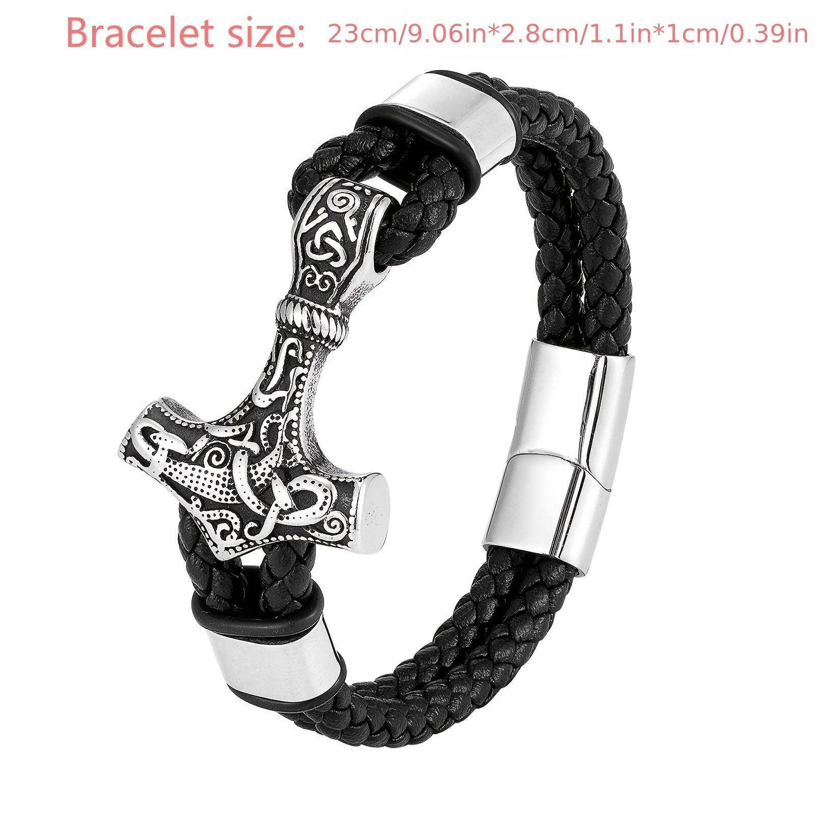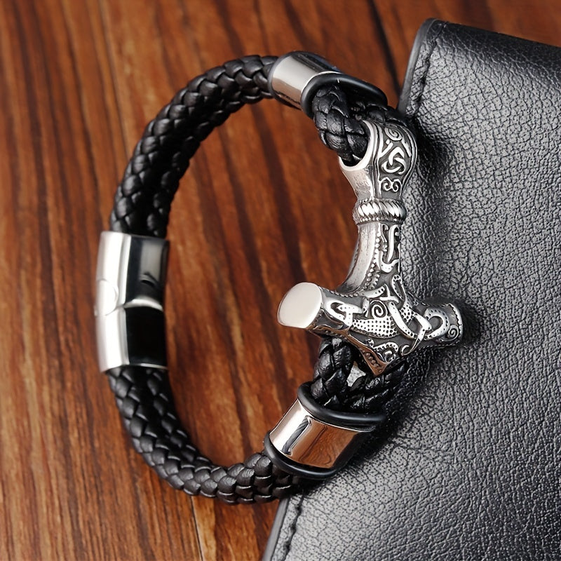 This stainless steel bracelet features a Thor's Hammer design, perfect for Nordic Viking enthusiasts. It is a stylish amulet bracelet that adds a vintage touch to your look.