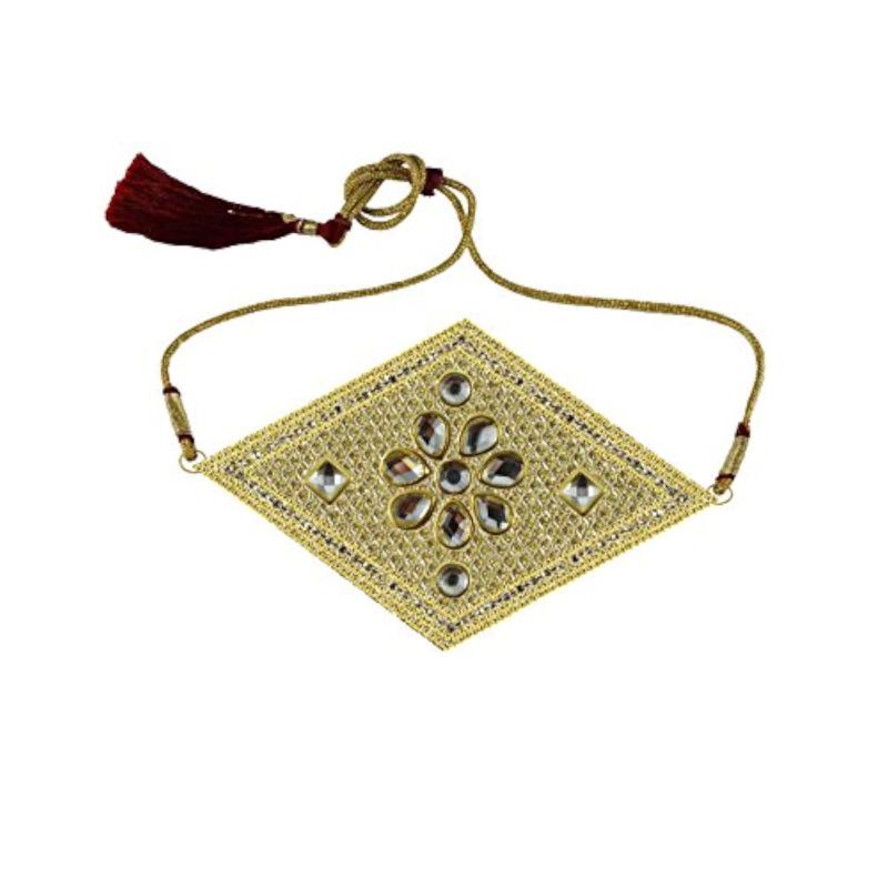 This stylish bajubandh is elegantly crafted with stone studs and brass material. It is adjustable to fit different arms sizes.