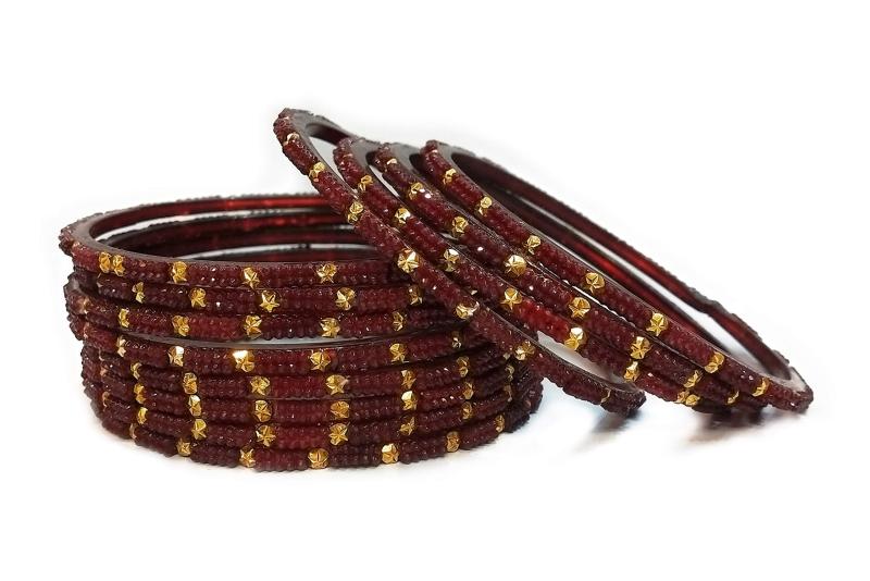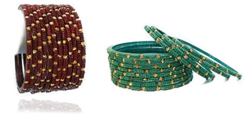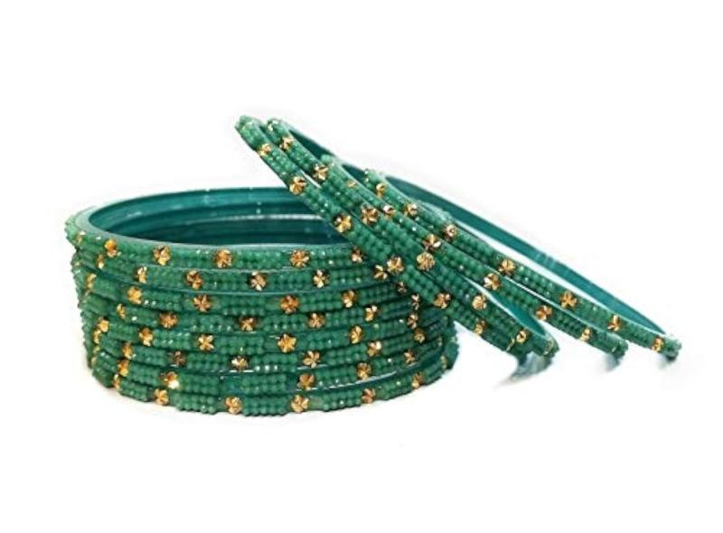 Elevate your festive look with this set of 24 glossy glass crystal bangles studded with crystal beads. Perfect for weddings and special occasions.