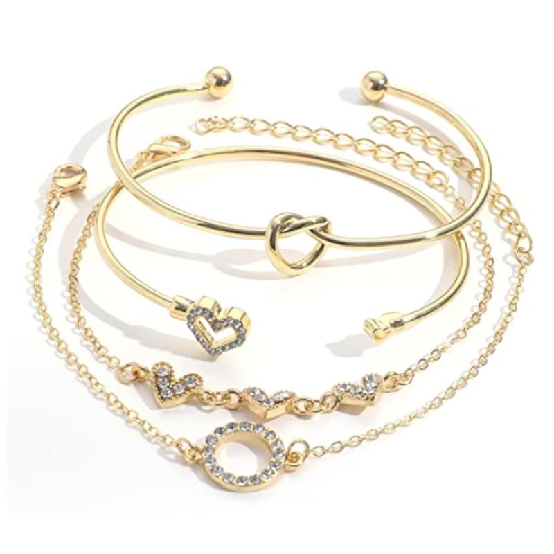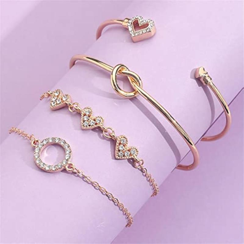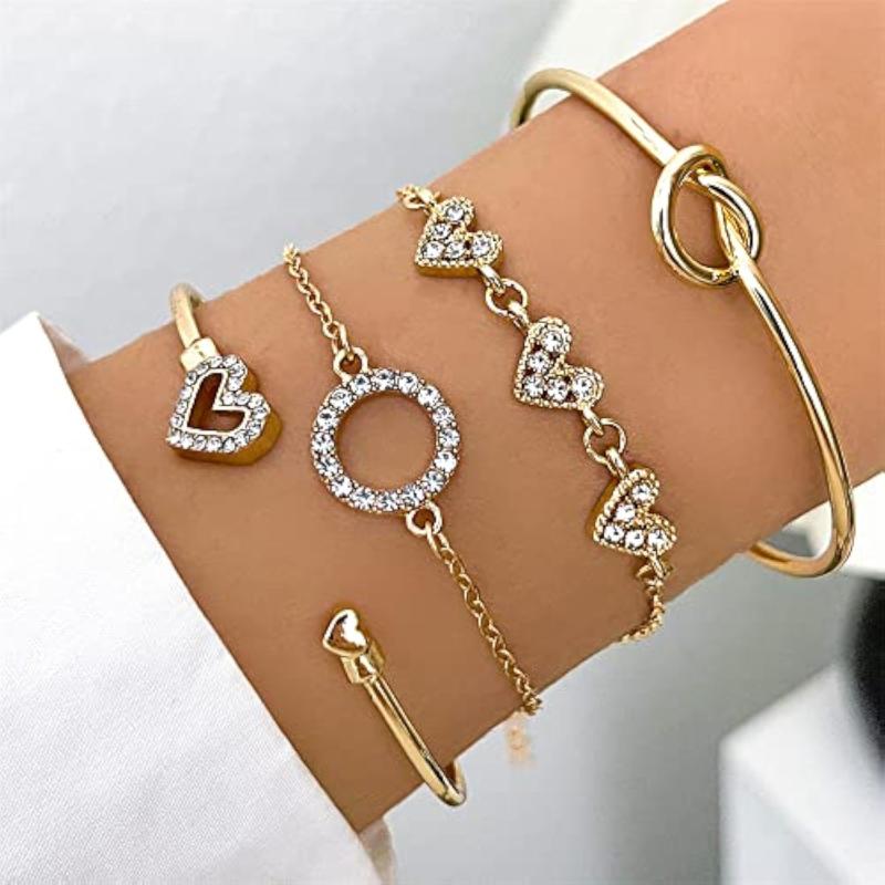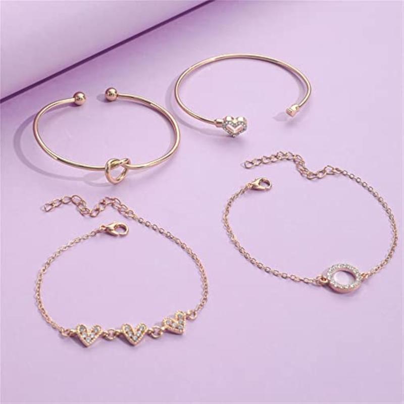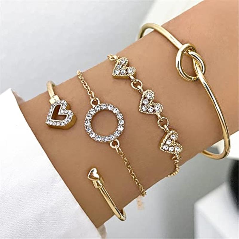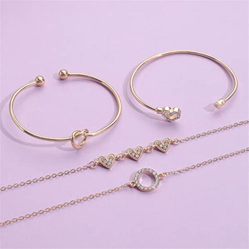 Elevate your style with this 4-piece multilayer bangle bracelet set featuring crystal heart charms. Perfect for adding a touch of sparkle to any outfit.
