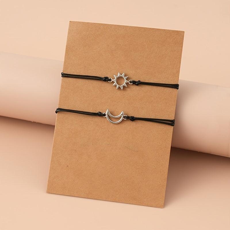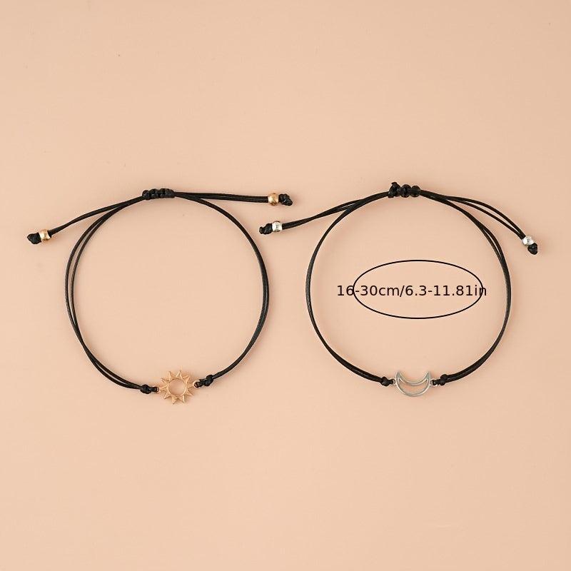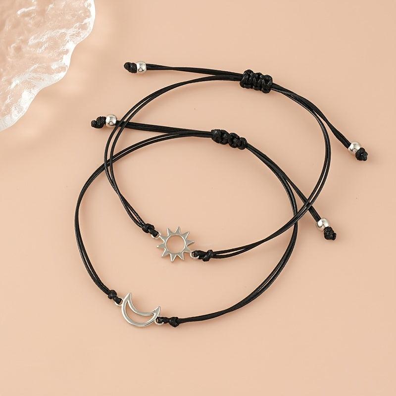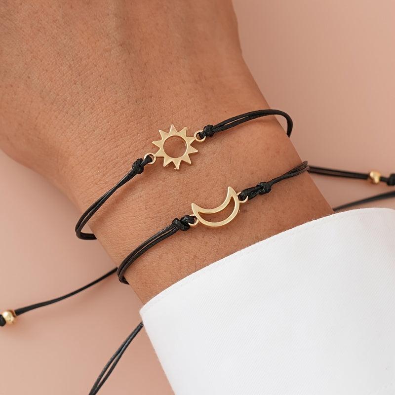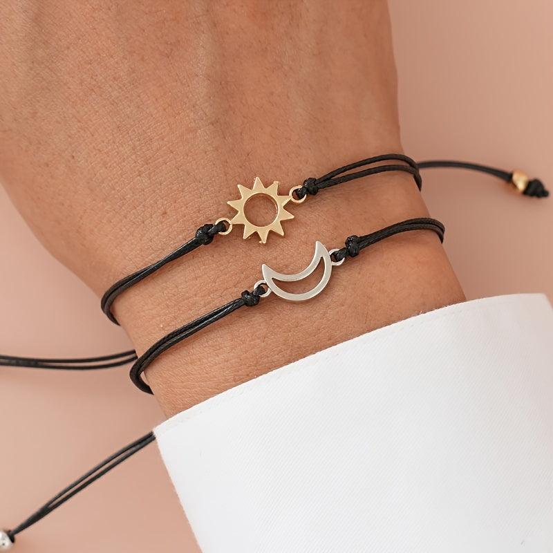 This charming bracelet set features a sun and moon design on adjustable braided cords, perfect for friends or couples. The symbolism of the sun and moon represents balance and harmony in relationships.