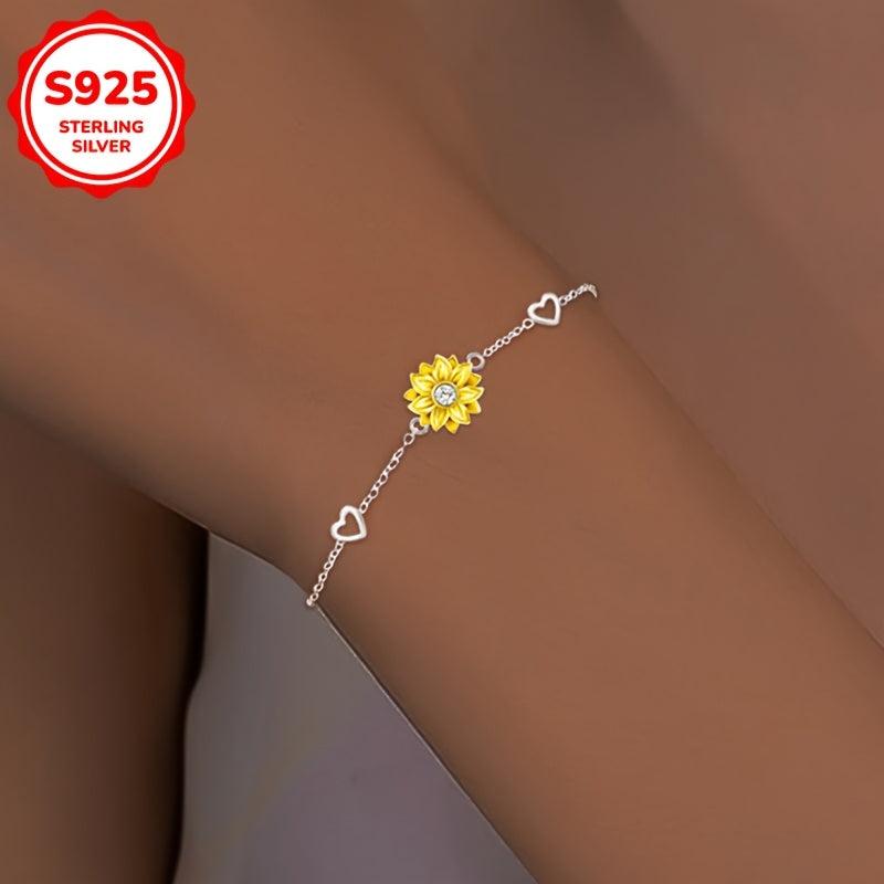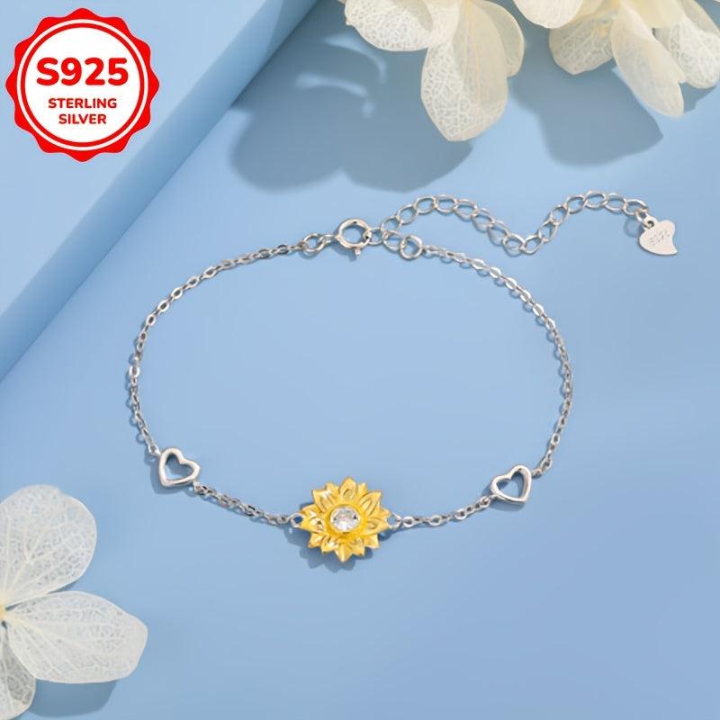 This stunning bracelet features a sunflower and heart charm encrusted with sparkling cubic zirconia stones. Crafted from high-quality 925 sterling silver, this piece is perfect for daily wear or as a thoughtful gift for a loved one.
