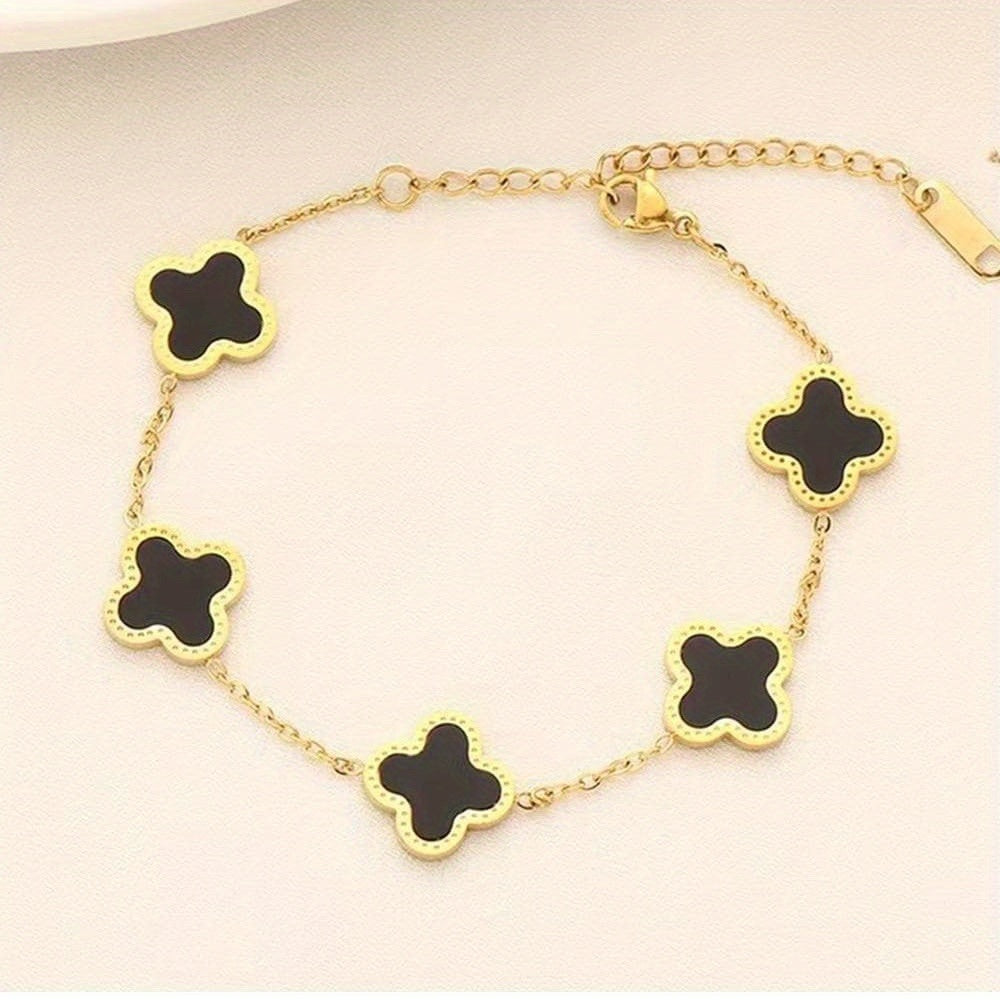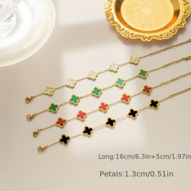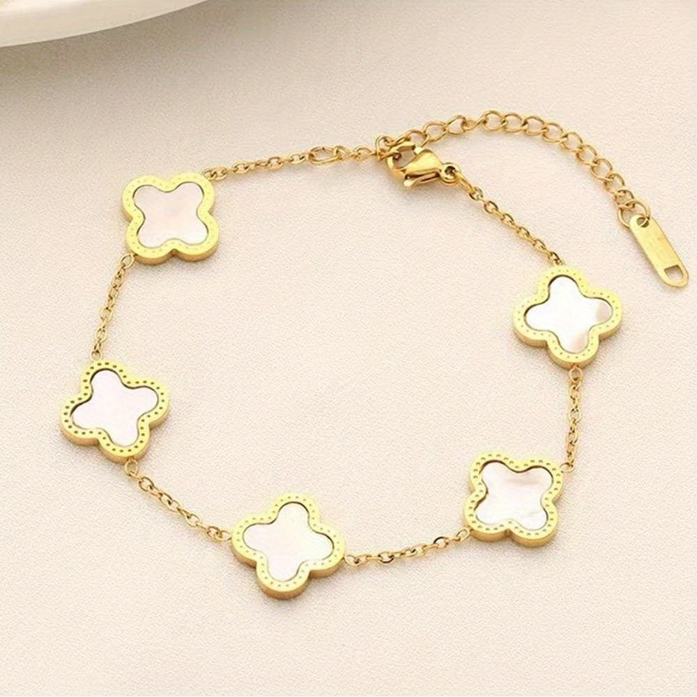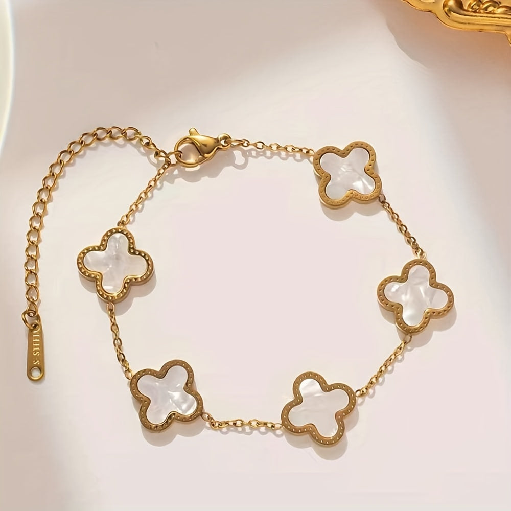 This beautiful bracelet features a four petal flower design made of titanium steel with an 18K plated finish. It is adorned with seashells, making it a unique and elegant piece of hand jewelry. Perfect as a gift for someone special.