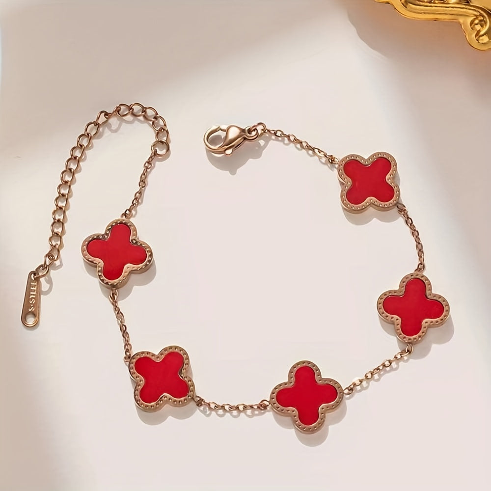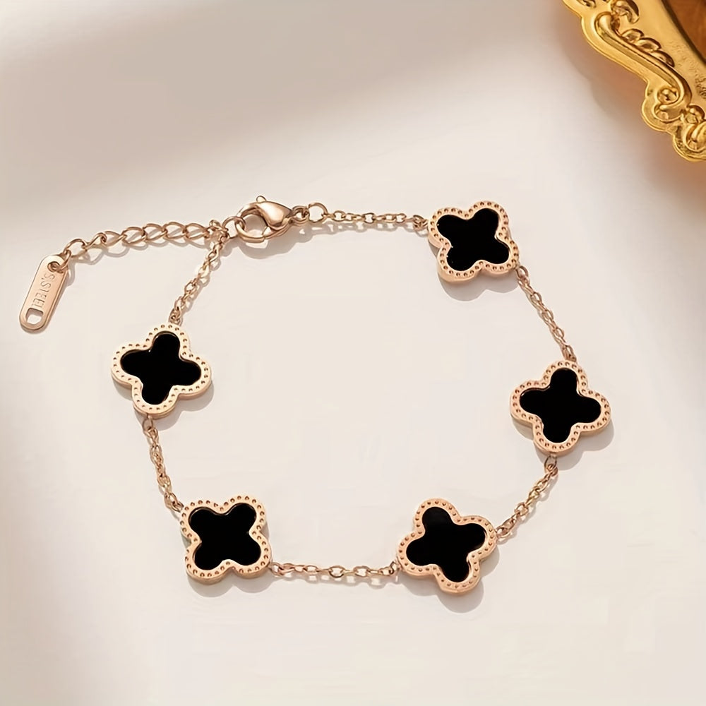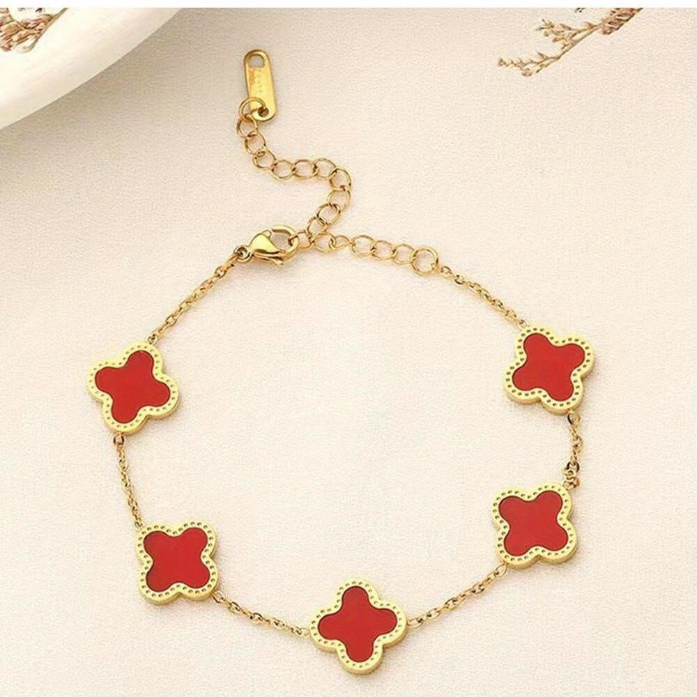 This beautiful bracelet features a four petal flower design made of titanium steel with an 18K plated finish. It is adorned with seashells, making it a unique and elegant piece of hand jewelry. Perfect as a gift for someone special.