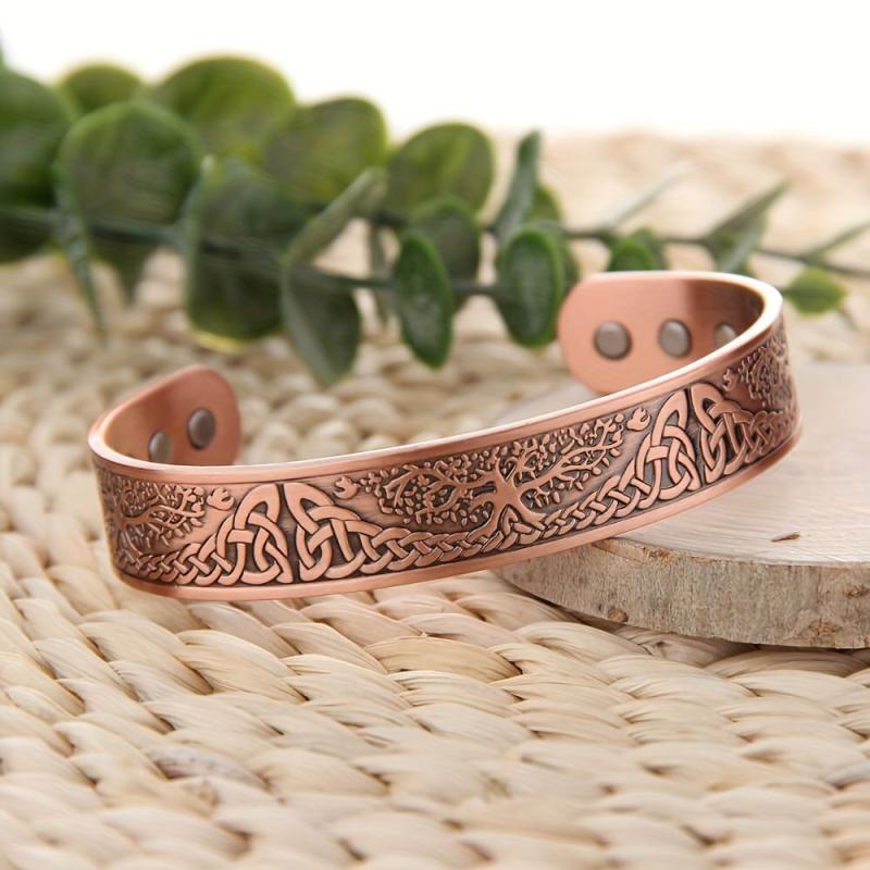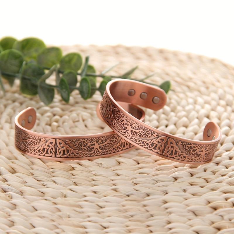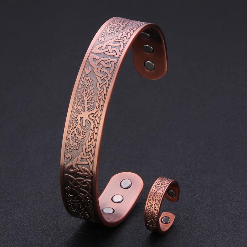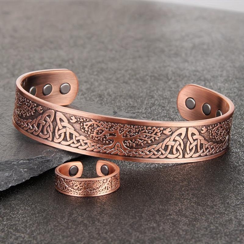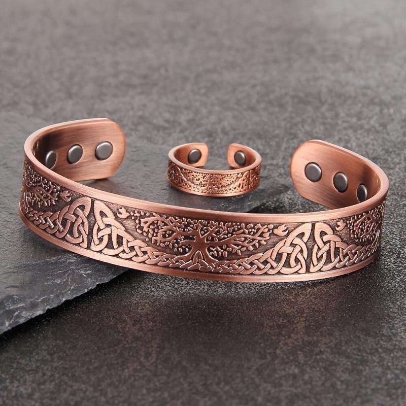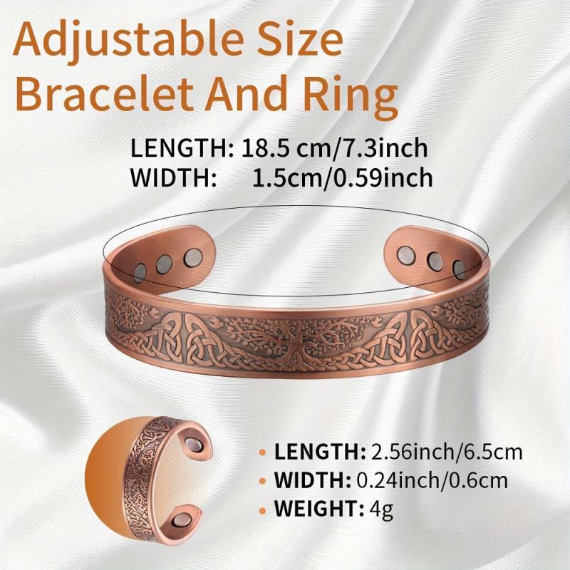 This set includes an adjustable copper bracelet and ring with a Tree of Life design. The magnetic titanium properties make it suitable for both men and women. A perfect gift for birthdays, Christmas, or any occasion.