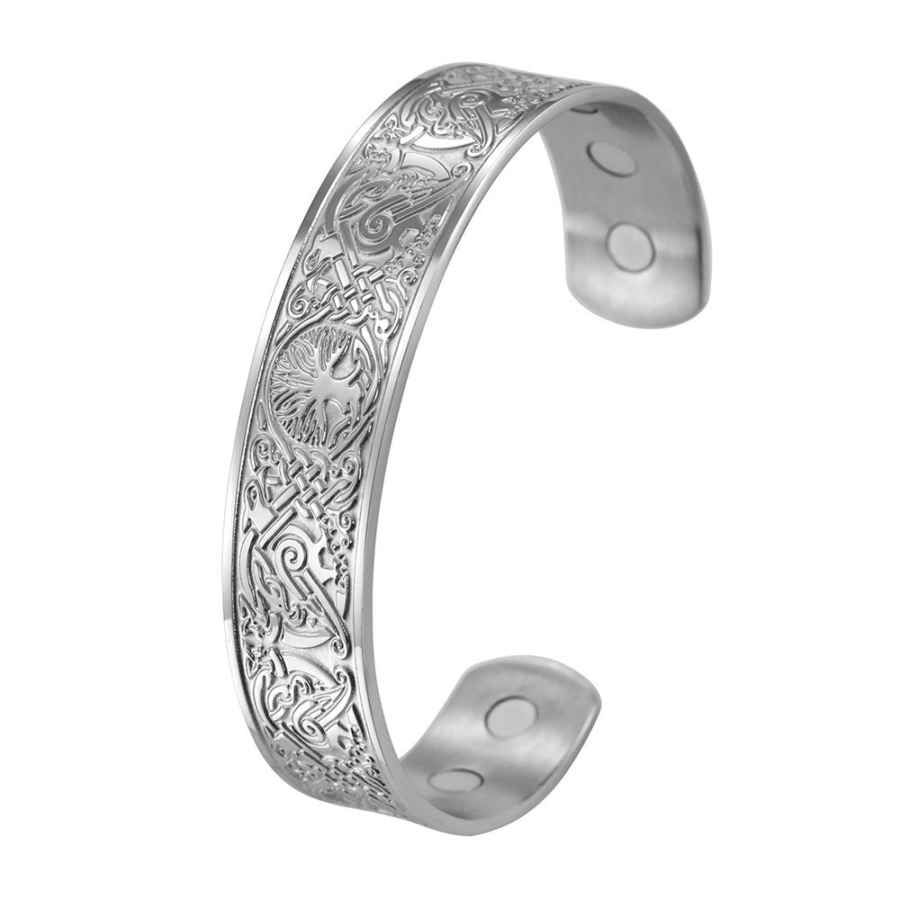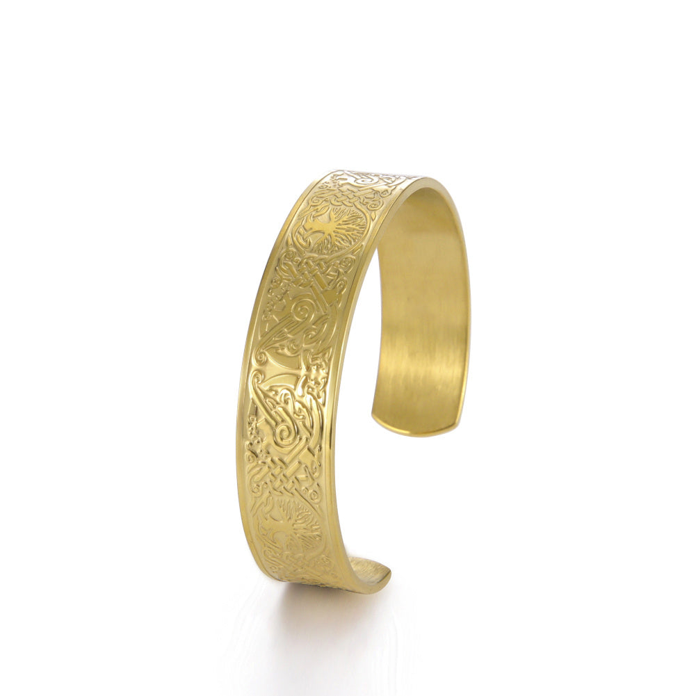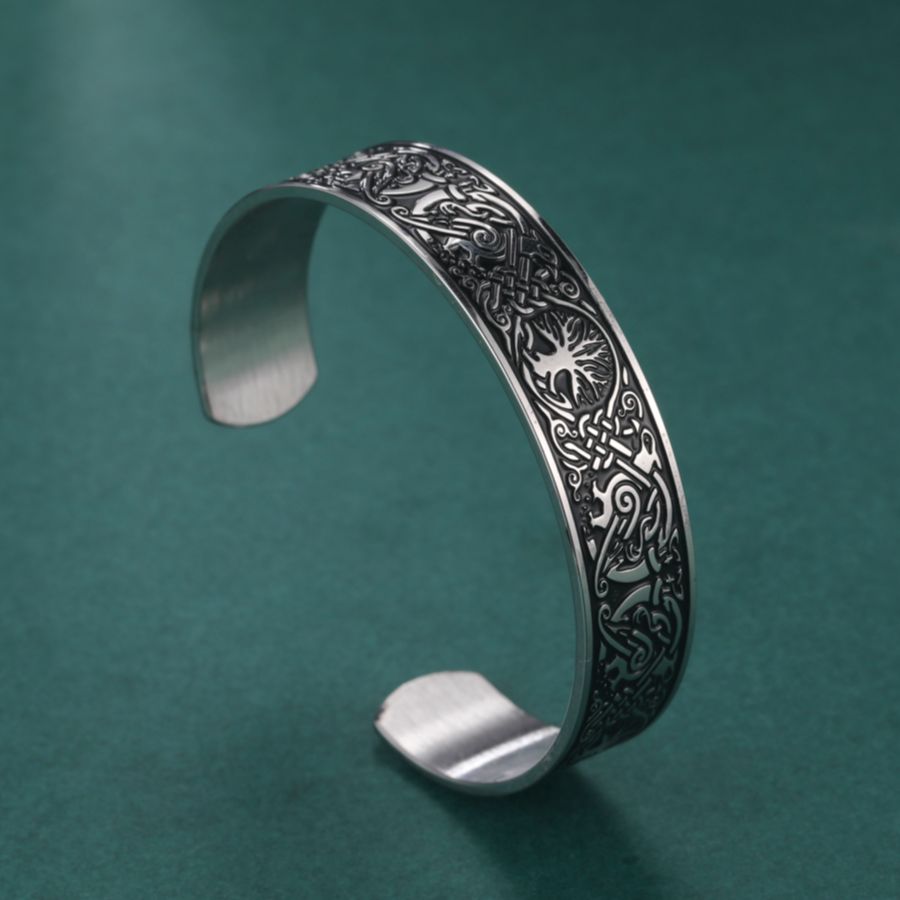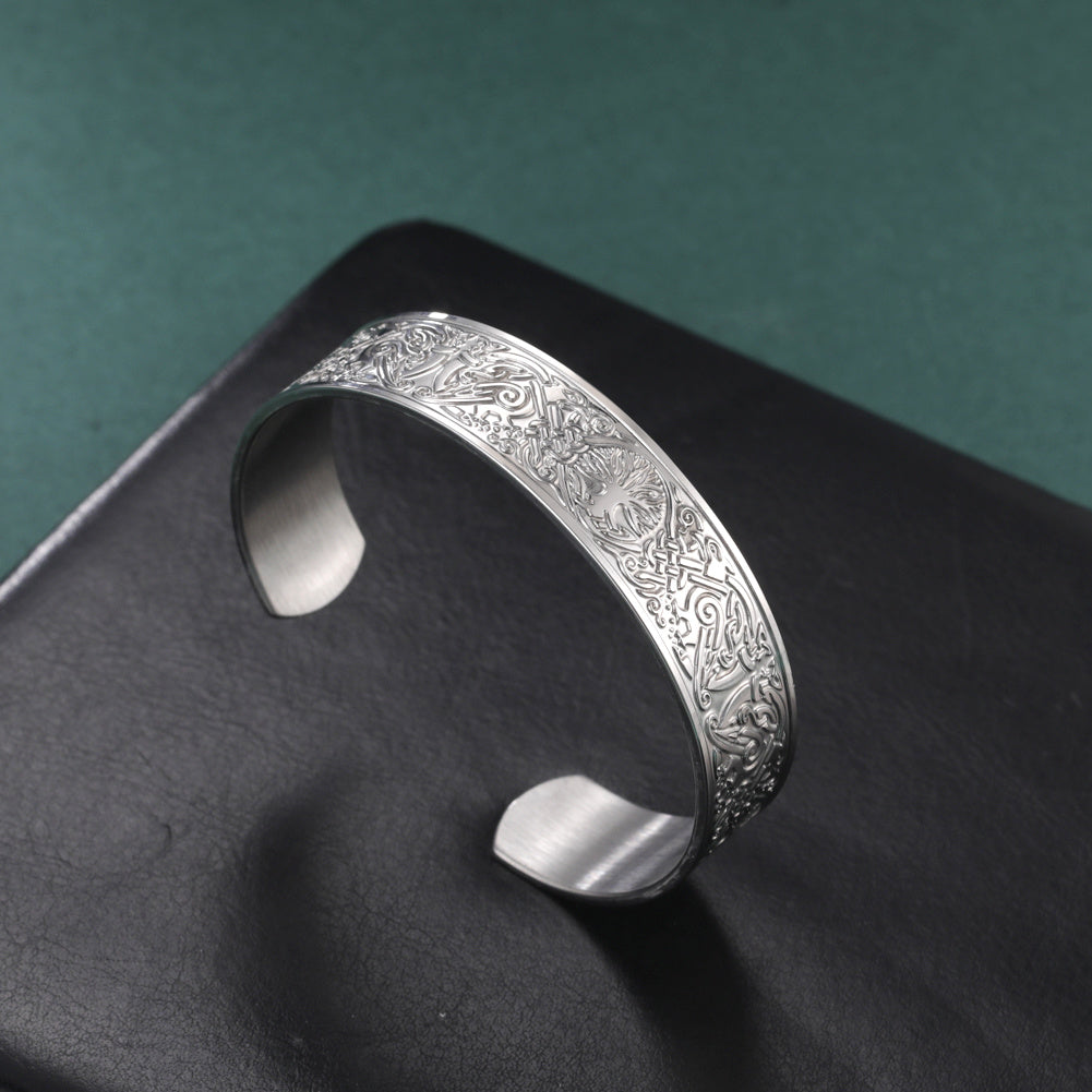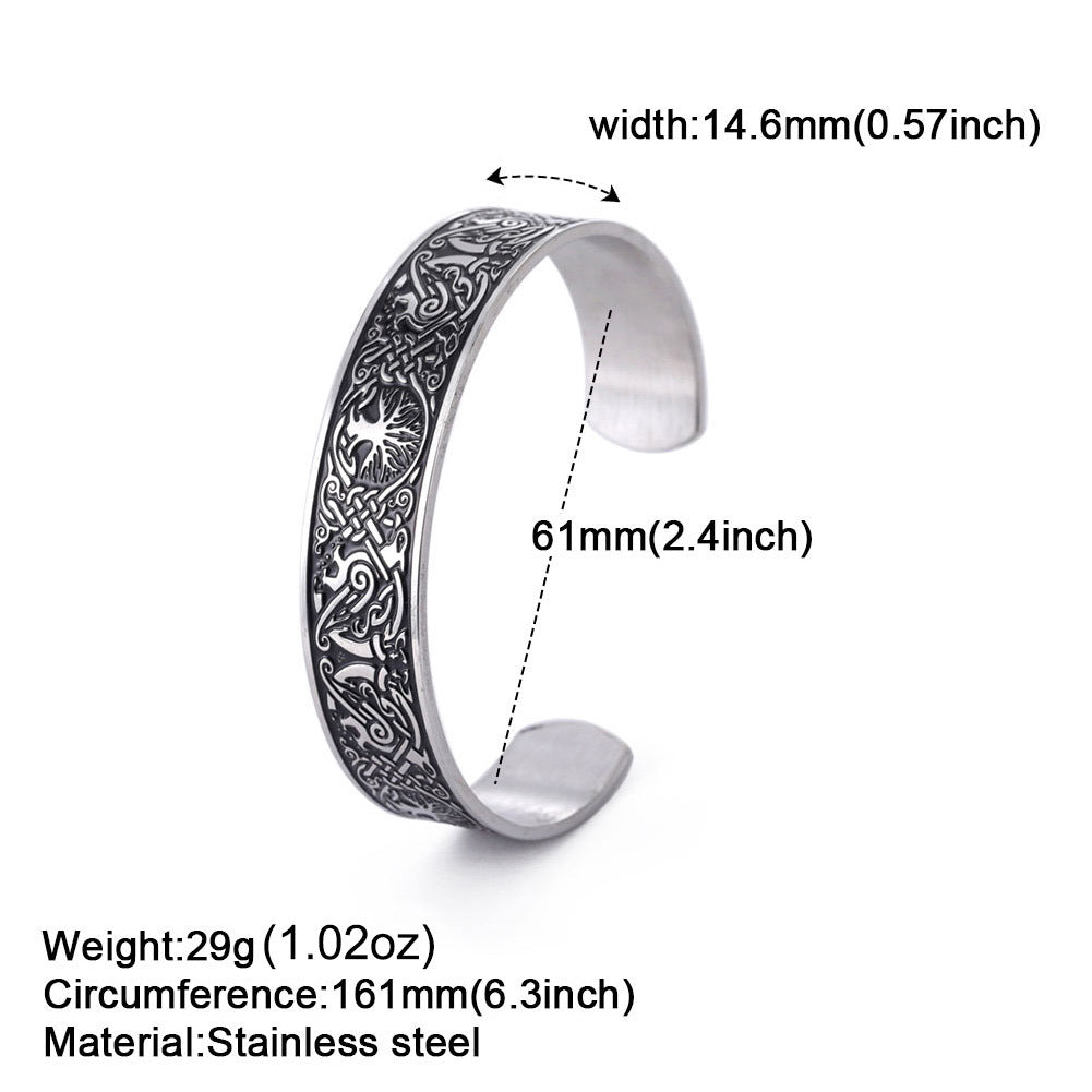 Vintage Viking cuff bangle featuring Tree of Life and Phoenix design. Made of stainless steel, this bracelet is a lucky amulet for women and men.