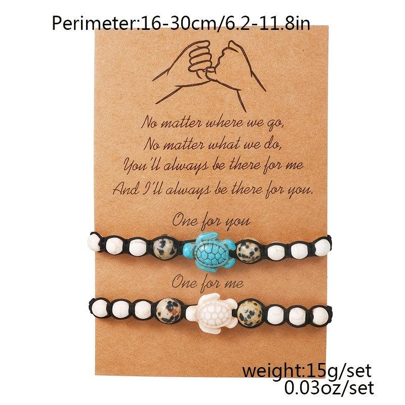 Get this small and extravagant hand-woven turquoise turtle bracelet set to add a touch of whimsical charm to your outfit. The set includes 2 versatile bracelets that showcase intricate geometric patterns.