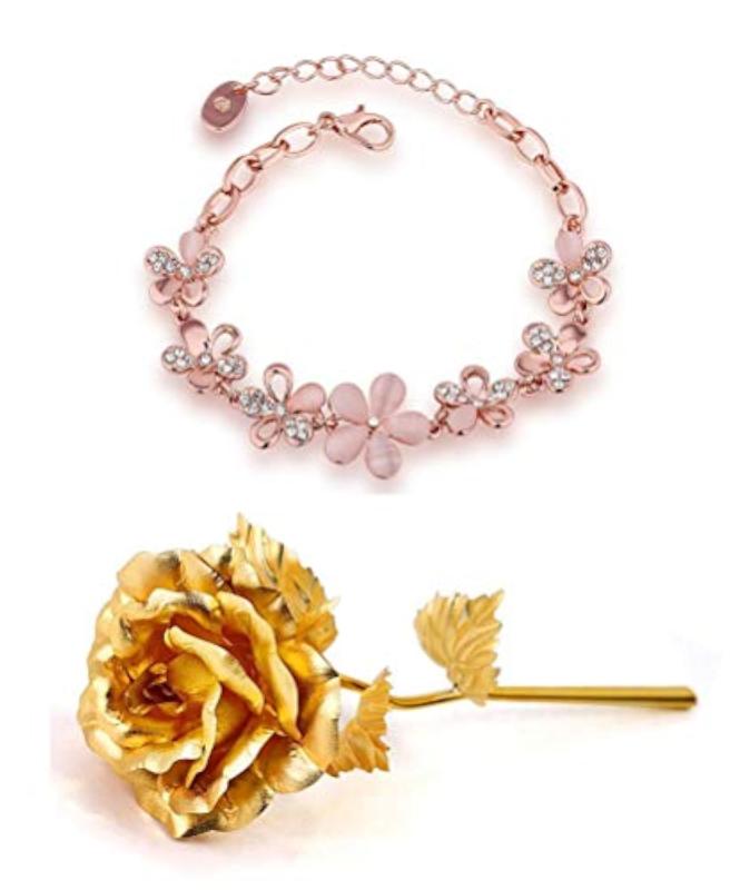 This elegant jewellery combo is the perfect gift for Valentine's Day. It includes a plated rose flower and a stylish bracelet, ideal for girls and women.