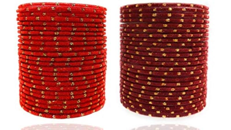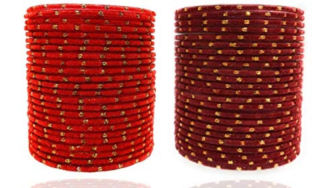 Elegant bangle set made of velvet fabric and glass for a touch of style and sophistication. Includes 48 bangles in assorted colors.