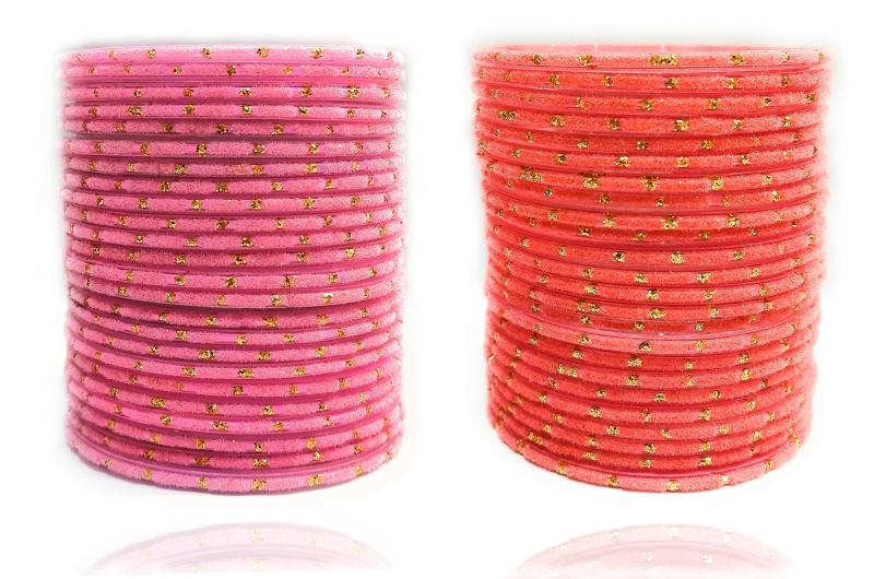 Stunning bangle set made of velvet fabric and glass in gajari and pink colors. Set includes 48 bangles.