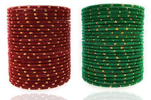 Add a pop of color to your outfit with this set of 48 bangles featuring a mix of maroon and green velvet fabric and glass beads. Perfect for adding a touch of elegance to any look.