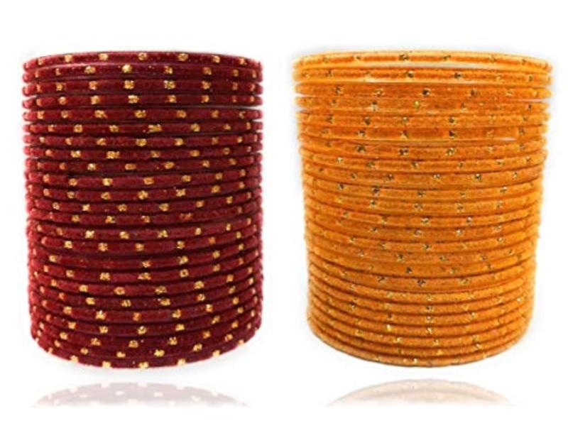 Elegant set of 48 bangles made of velvet fabric and glass in maroon and haldi colors.
