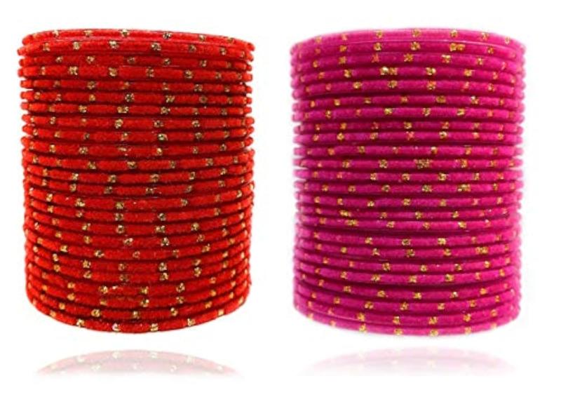 Enhance your style with this set of 48 bangles made of plush velvet fabric and adorned with beautiful glass embellishments.