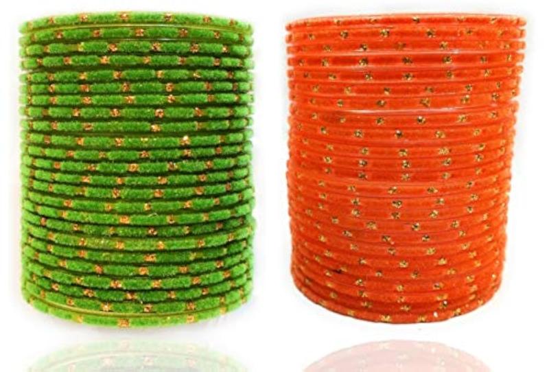 Elegant bangle set features velvet fabric and glass beads. Perfect for women's accessory collection.