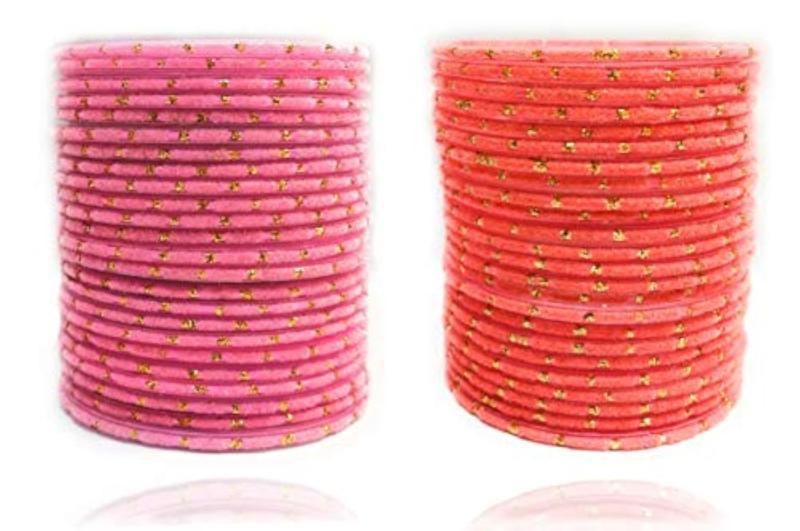 Elegant set of 48 bangles made from velvet fabric and glass beads in Gajari and Pink colors.