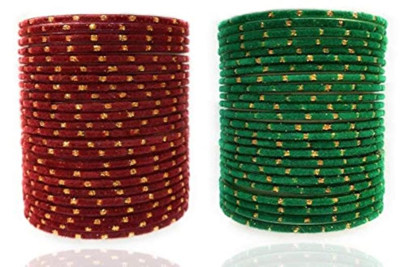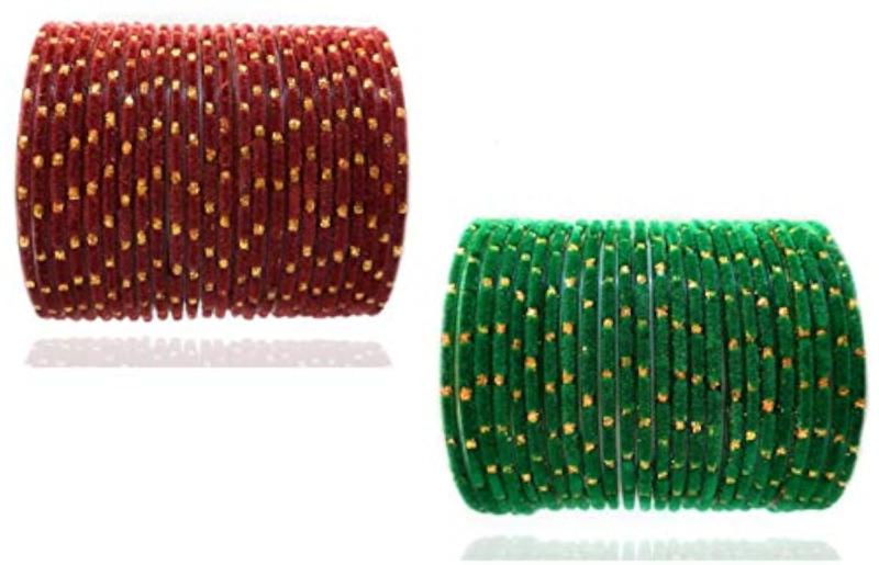 Elegant bangle set made of velvet fabric and glass in maroon and green colors. Pack includes 48 bangles.