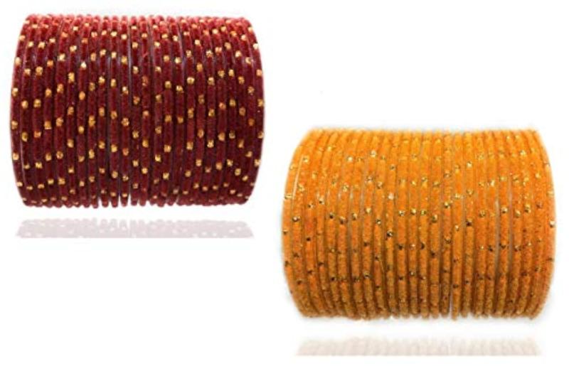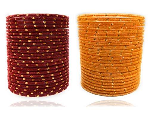 Elegant set of 48 bangles featuring maroon velvet and Haldi-colored glass beads.