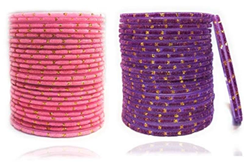 This pack includes 48 bangles in vibrant pink and purple colors made from velvet and glass. Perfect for adding a touch of glamour to any outfit.