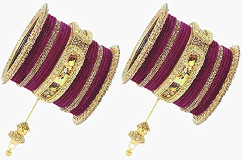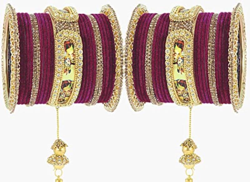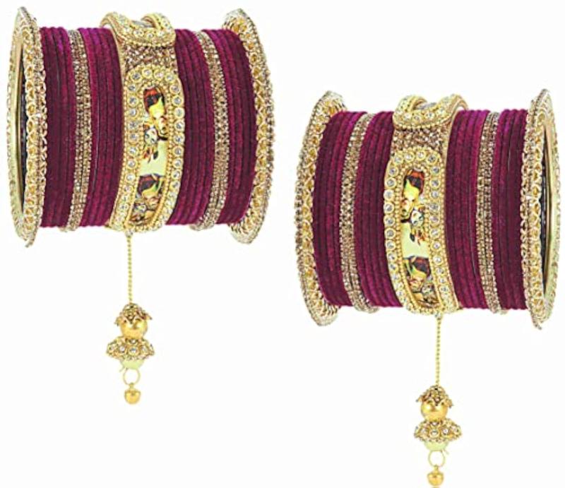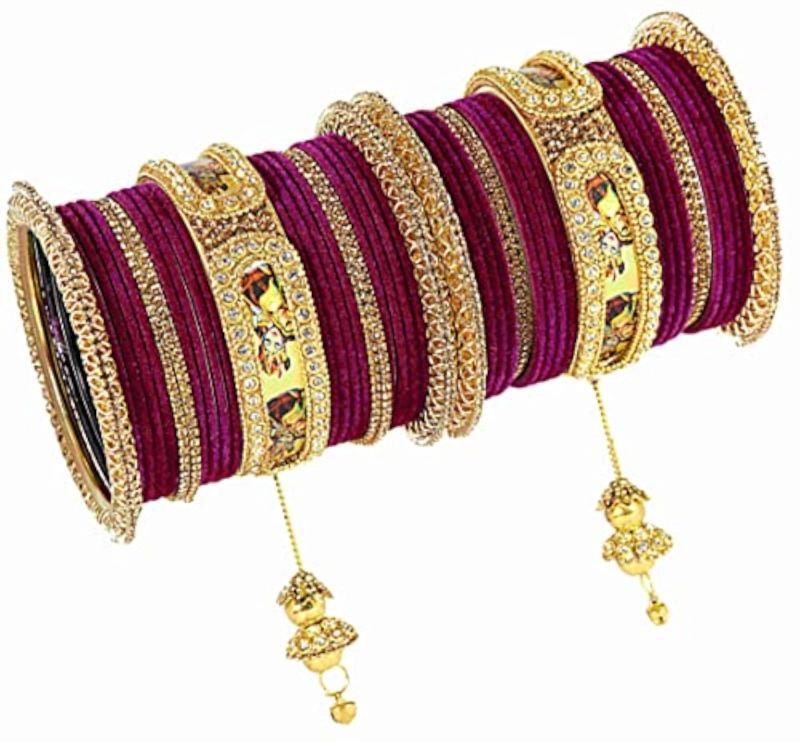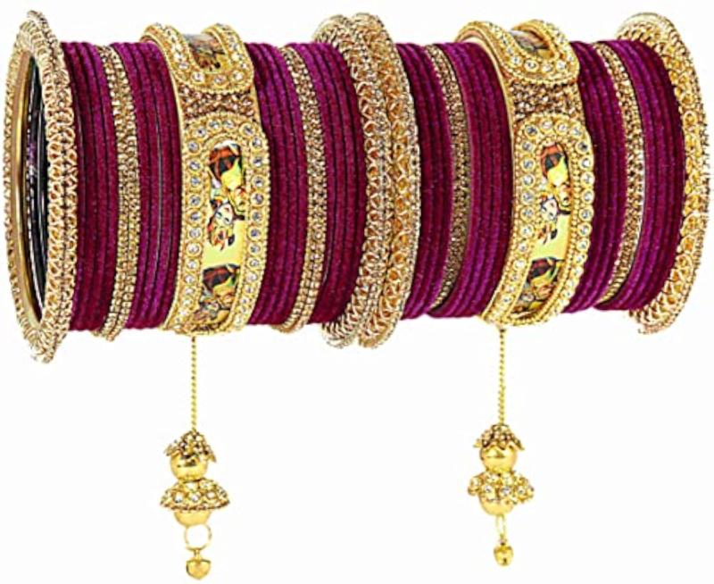 Add a touch of elegance to your outfit with this bangles set featuring a beautiful Raadha Krishna print. The set includes non-precious metal base bangles with velvet accents and pearls latkan for a stylish look.